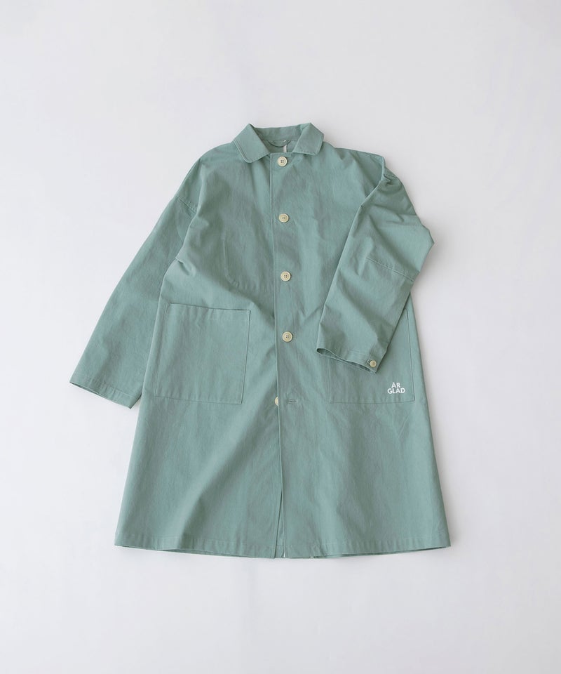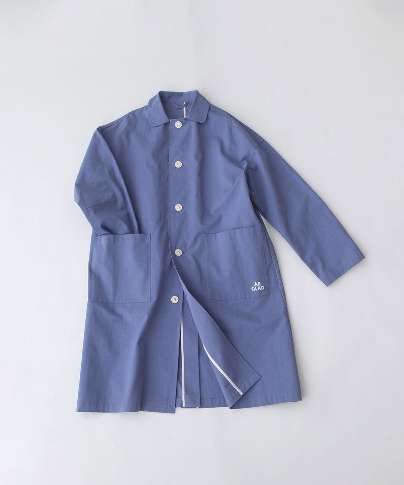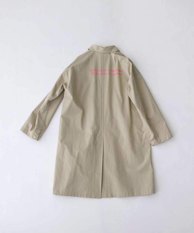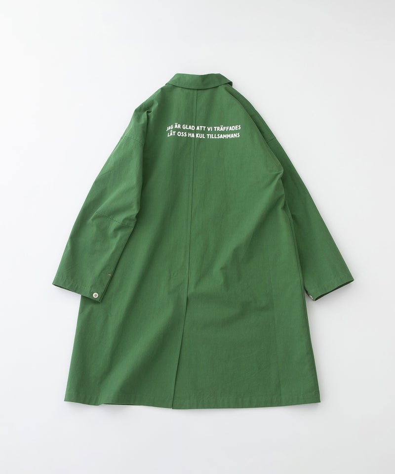 バックロゴプリント入りのさらりと羽織れるワークコート。春秋着られる厚すぎない軽めのコットンツイルを使用しています。前左ポケットにもプリントを入れてさりげないポイントに。ユニセックス対応で袖丈は長めです。内ポケットつき。