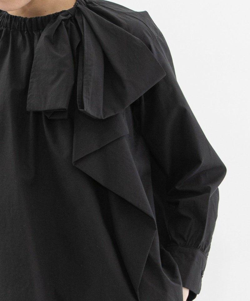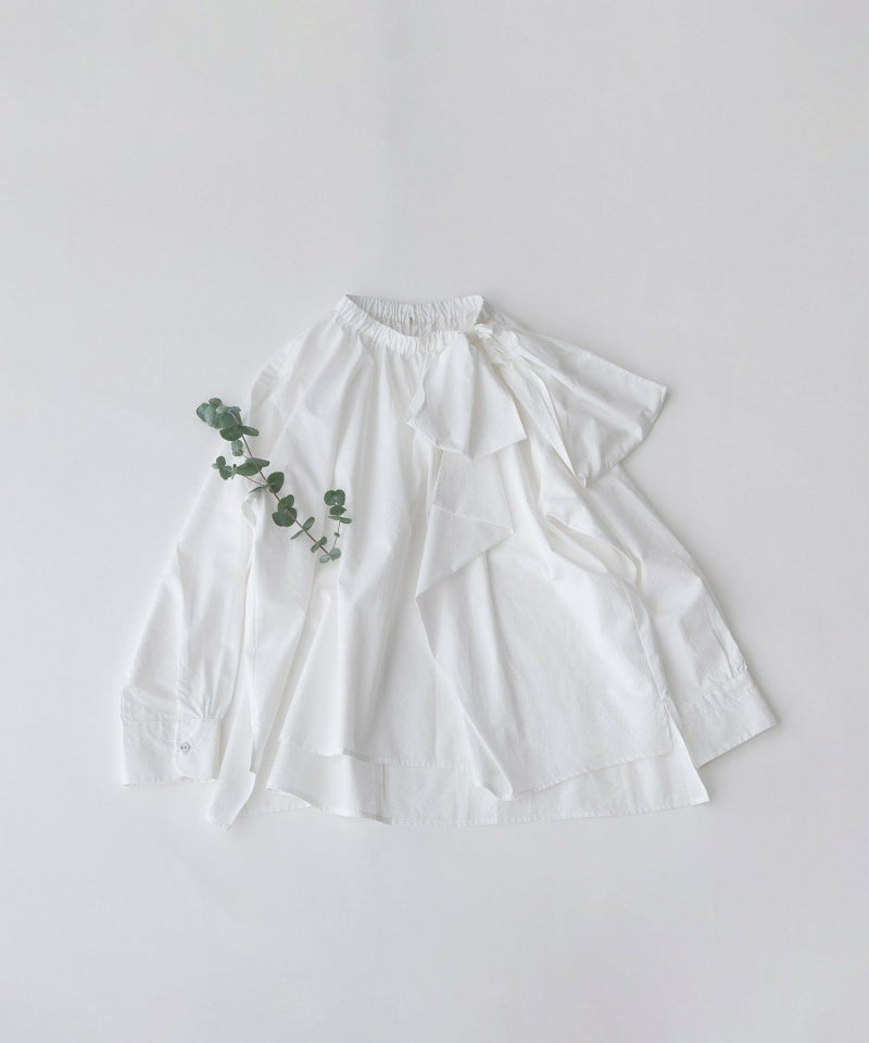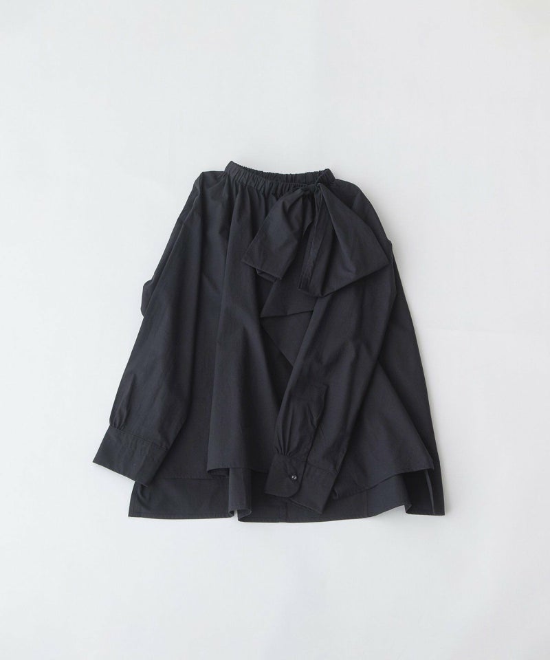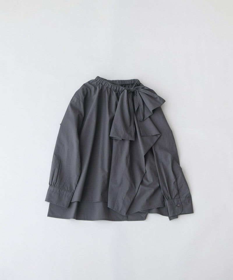 左前アシメトリーにタックをとったリボンデザインのシャツ。コットンのように見えながら、程よくしなやかな生地を使用し、エレガントすぎないカジュアルな甘さを表現しています。ネックタブに通したリボンは長さなどの調整が可能。ネックにはゴムを入れ、着脱しやすい仕様です。後ろが長めの前後差があり、長すぎない9分袖に仕上げています。