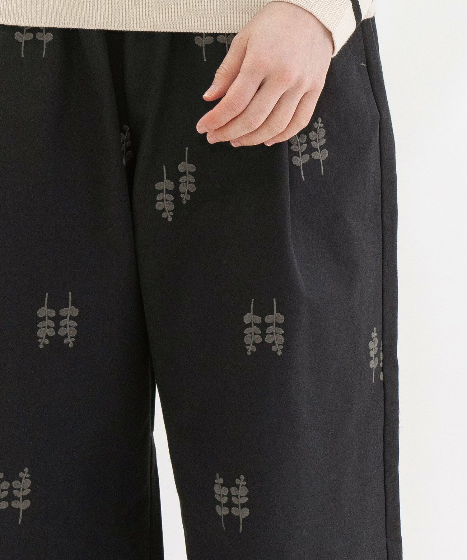 軽い綿ナイロンのグログラン生地に、ユーカリ柄の刺繍を施したオリジナル生地の8分クロップドパンツ。フロントはワンタックで広がりすぎないセミワイドシルエットです。両サイドのポケット口にはスカラップステッチがあり、さりげないアクセントに。ウエストはゴム仕様で、内紐つき。
