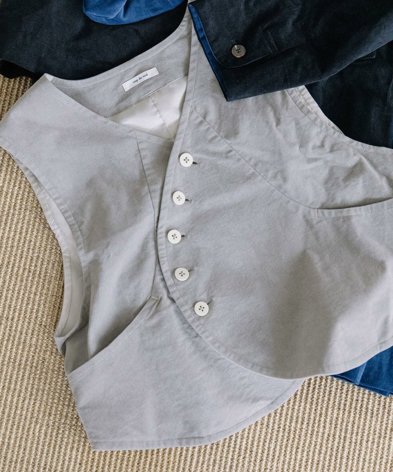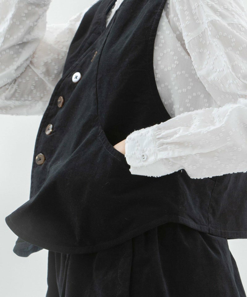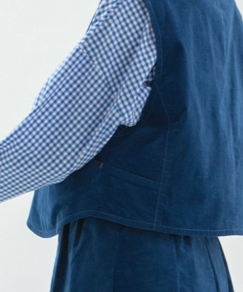 別珍素材のベスト。起毛の微光沢で上品なカジュアルを演出できる1枚です。洗いをかけることで普段使いできる雰囲気に仕上がりました。ストレッチ入りで動きやすく、しっかりとした生地が特徴的。ヴィンテージ風の丸みのある打ち合わせがデザインポイント。両サイドポケットあり。
