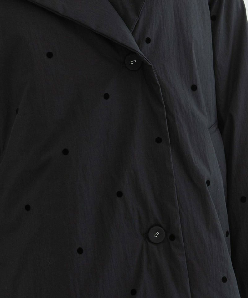 軽いコットンナイロン素材にフロッキードットプリントをのせた柔らかくて軽い中綿コート。カジュアルすぎず上品に着られれる防寒コートです。衿元をアレンジして、スタンドカラー、ステンカラー、テーラードと3wayで着用をお楽しみいただけます。袖口はゴムを入れてふんわりとした仕上がりに。ボタンは共くるみボタンになっています。