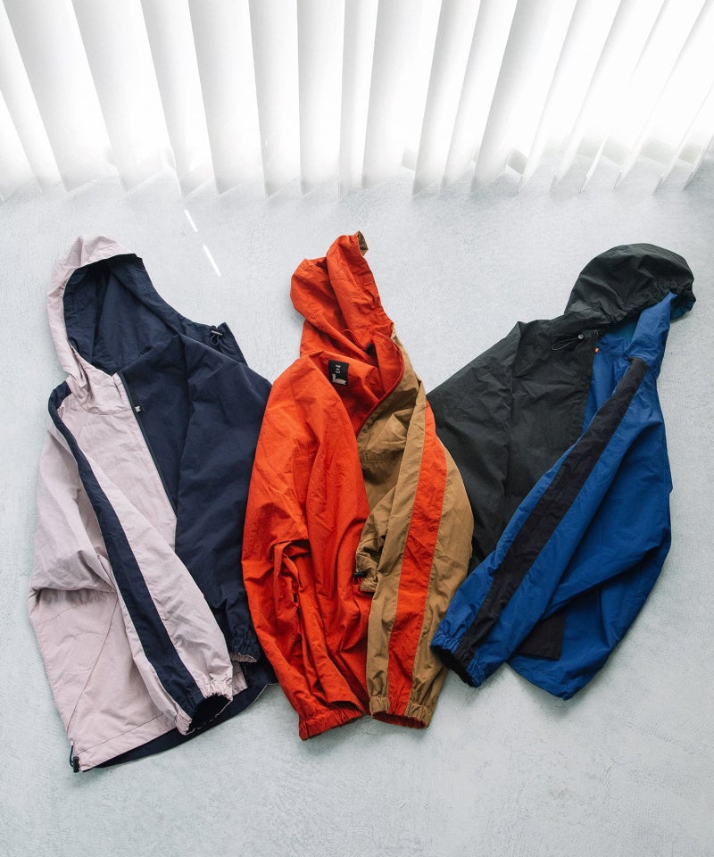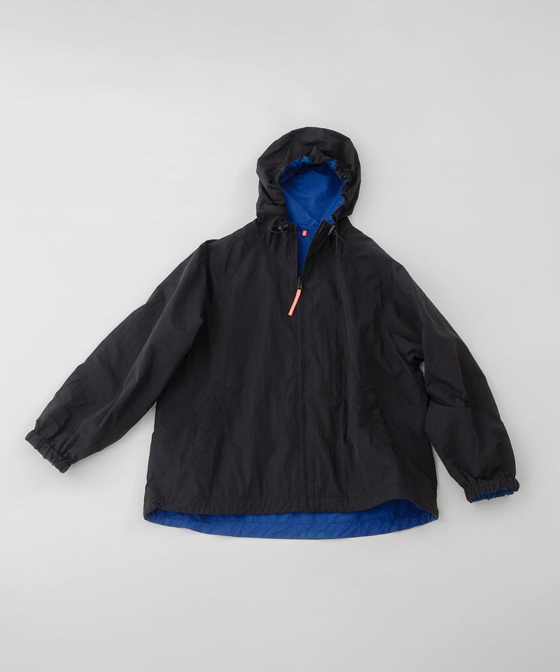 軽量ナイロンタフタ生地のリバーシブルパーカ。表はシンプルな無地、裏は配色ライン入りのスリーブデザイン。撥水加工付きで、軽い雨の日も安心です。片面の背中にスワンネームが入り、フード着用時のポイントに。