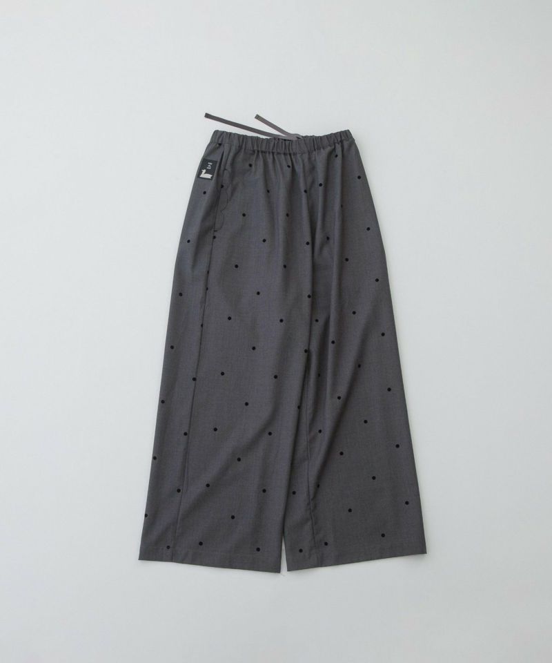 リラックスしたシルエットのラフに履けるイージーワイドパンツ。秋や春の端境の季節のきちんとしたい時期に重宝するフォーマル生地の「トロピカル」で仕立てました。ポリエステルレーヨンで、しわになりにくくイージーケアがうれしいシリーズです。フロッキーのドットプリントとブラックの2色展開。シンプルなトップスでもモードに決まるボトムです。ウエストはゴム仕様、両サイドポケットのスカラップステッチや、右後ろのスワンネームがさりげないアクセントを効かせています。