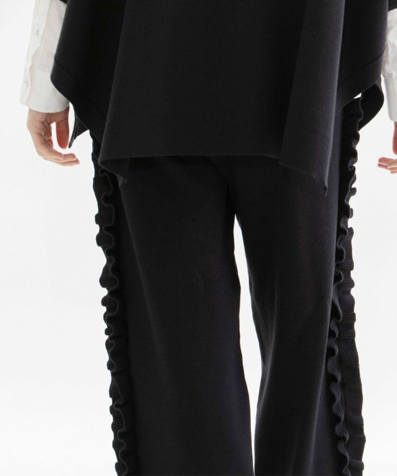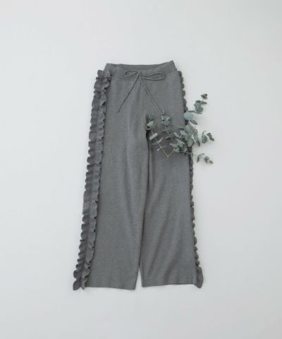 12ゲージ総針編みで仕立てた、レーヨンポリエステル素材のパンツ。毛玉になりにくく、お手入れが簡単な通年アイテムです。すとんと落ちるストレートラインのフルレングス。脇にあしらったニットフリルがアクセント。ウエストはゴム仕様でリラックスして履いて頂けます。編み機すべての針を使った総針編みは、手間と糸を惜しまず使用しているため、しっかりとしたハリ感と上品な目の詰まりが特徴。光沢のあるレーヨン糸にポリエステル糸を添えてプレーティングすることで、美しい表情と型崩れしにくい仕上がりになっています。