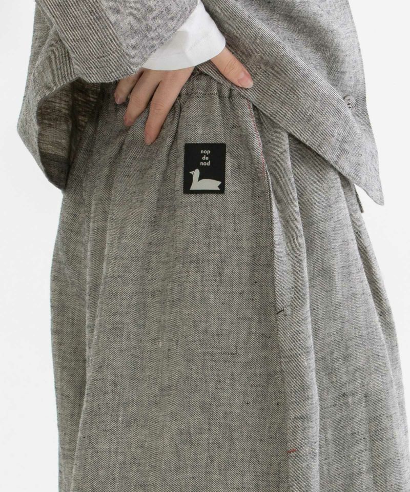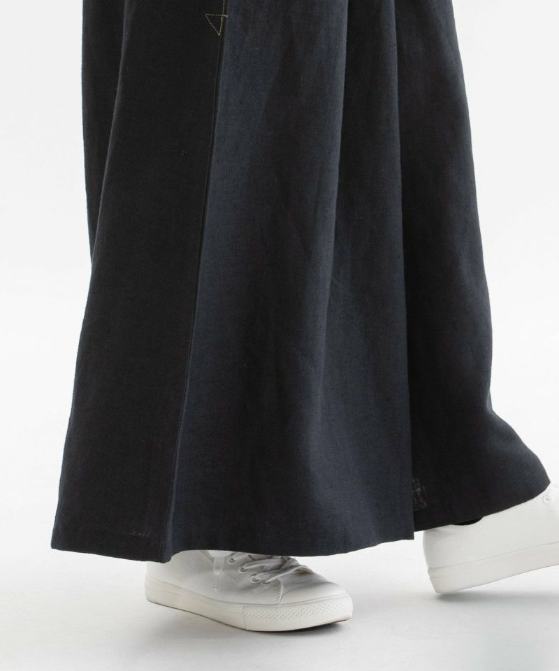 暖かみのある素材のマキシパンツ。くるぶしまで届くマキシ丈で、ラフに着こなしながらきれいに広がるフレアシルエットが優雅なボトムです。ツイード見えする麻100%のリネンビエラ起毛を使用。ウエストはゴム仕様で、内紐つき。右後ろのスワンネームやサイドの配色三角ステッチ、両サイドポケットのスカラップステッチなどもさりげないアクセントを効かせています。