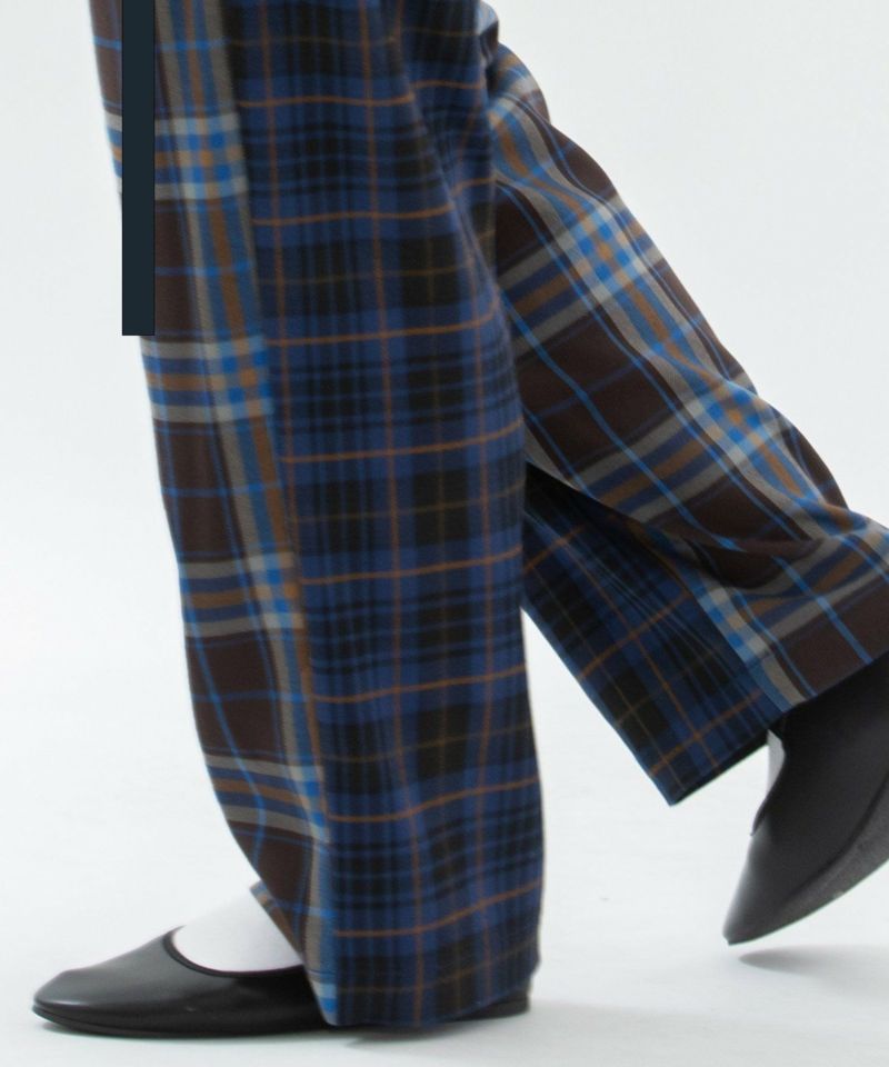 2種類のチェックを使ったリラックスしたシルエットのイージーパンツ。ポリエステルレーヨンの扱いやすい生地を使いました。右後ろにスワンネームでワンポイント。ウエストはゴム仕様・内紐付きでリラックスして履いて頂けます。両サイドポケットつき。