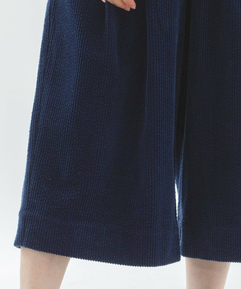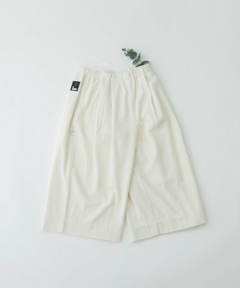 太畝コーデュロイ素材で仕立てたクロップドタックパンツ。フロントのタックから程よく広がるシルエットが絶妙で足首がきれいに見えるバランスです。右後ろのスワンネームがワンポイント。両サイドのポケット口にはスカラップステッチがあり、さりげないアクセントに。ウエストはゴム仕様で内紐つきです。
