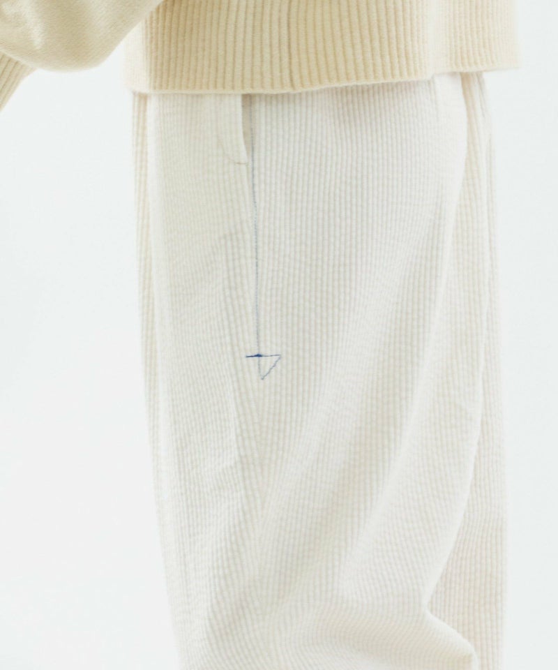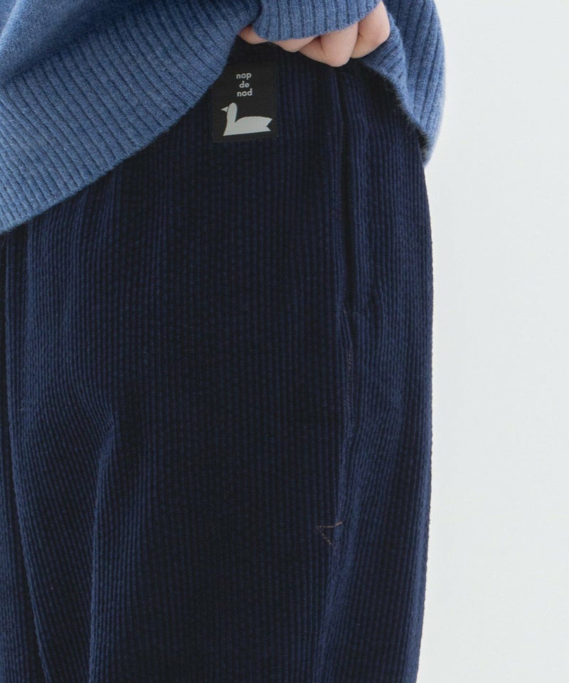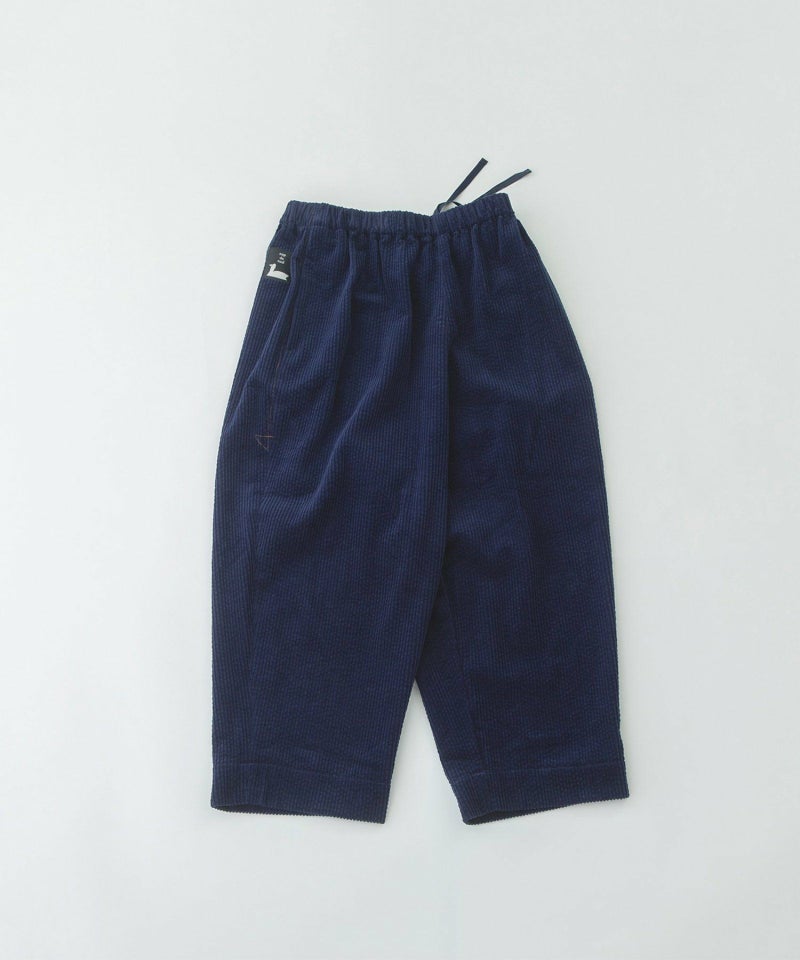 太畝コーデュロイ素材で仕立てたPommeパンツ。股上が深くリラックスしたゆるさがありながら、高い位置にボリューム感を持たせているのでバランス良く着こなせます。右後ろのスワンネームがワンポイント。両サイドのポケット口にはスカラップステッチがあり、さりげないアクセントに。ウエストはゴム仕様で内紐つきです。