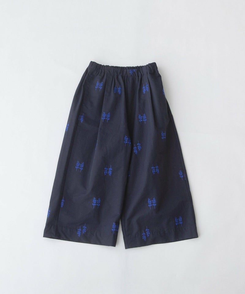 軽い綿ナイロンのグログラン生地に、ユーカリ柄の刺繍を施したオリジナル生地の8分クロップドパンツ。フロントはワンタックで広がりすぎないセミワイドシルエットです。両サイドのポケット口にはスカラップステッチがあり、さりげないアクセントに。ウエストはゴム仕様で、内紐つき。