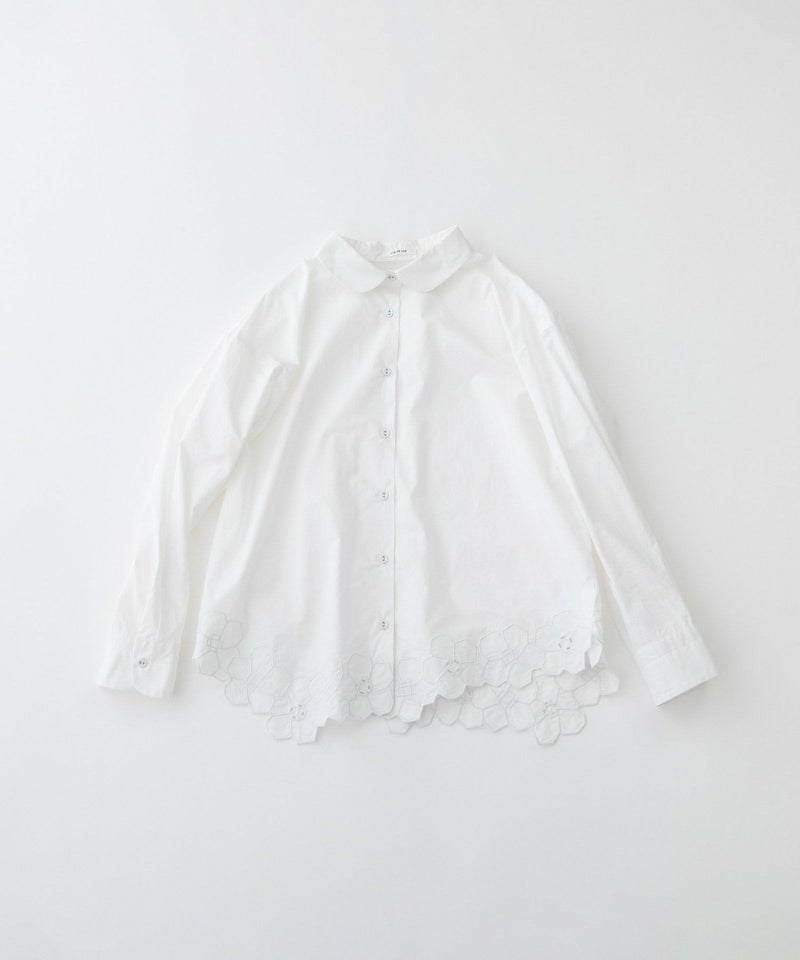 裾にフラワーモチーフのカットワーク刺繍をほどこしたシャツ。パリッとした生地のシャツに直線モチーフの刺繍をランダムに並べ、甘すぎない雰囲気に。ジャケットや、トレーナーやニットの裾から刺繍を出して、こなれたレイヤードがかなうアイテムです。