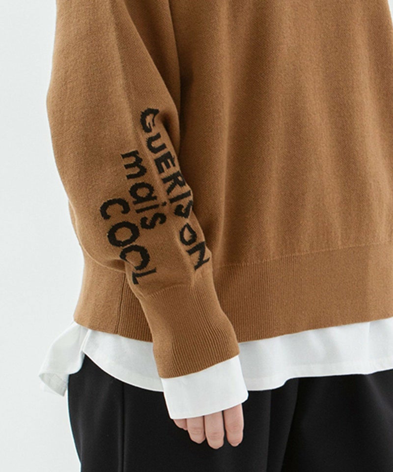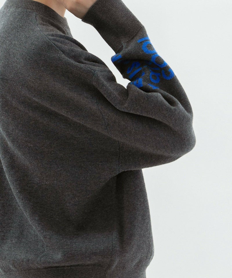 ゆるいサイズ感のスエット風ニット。両袖にそれぞれロゴを入れたクールなトップスです。表側はコットン、裏側がキッドモヘア混のダブル編みで、起毛スエットのような暖かさがありながら春先まで長く着られるアイテムです。裏側の糸が表に出るダブルジャガード編みで、柄部分は少しふんわりとした見え方になっています。