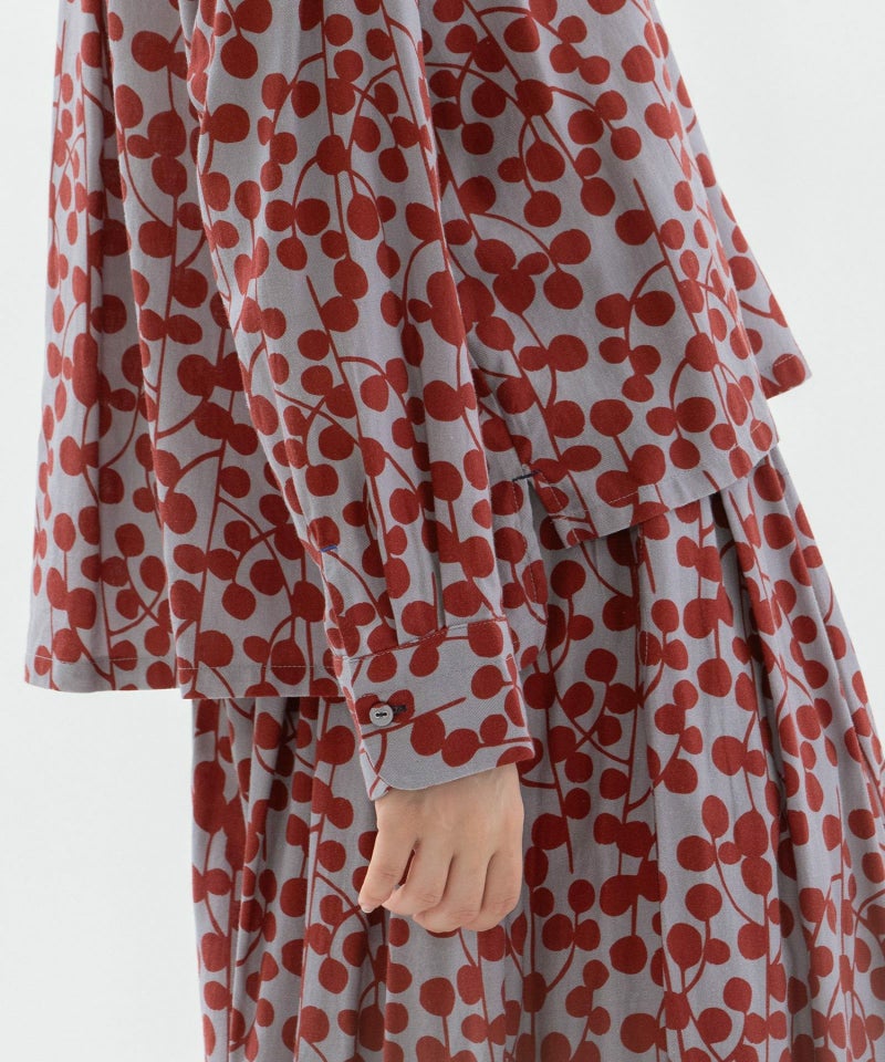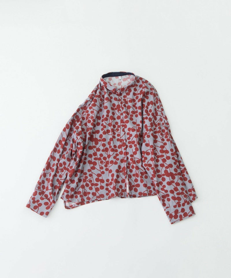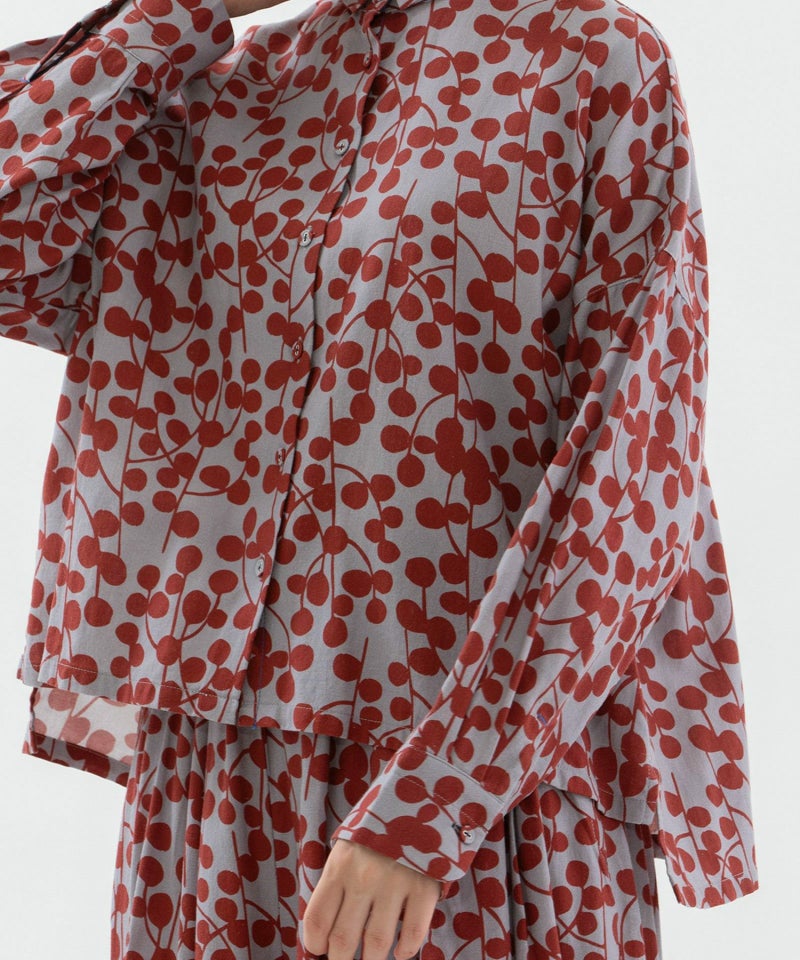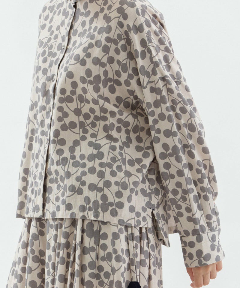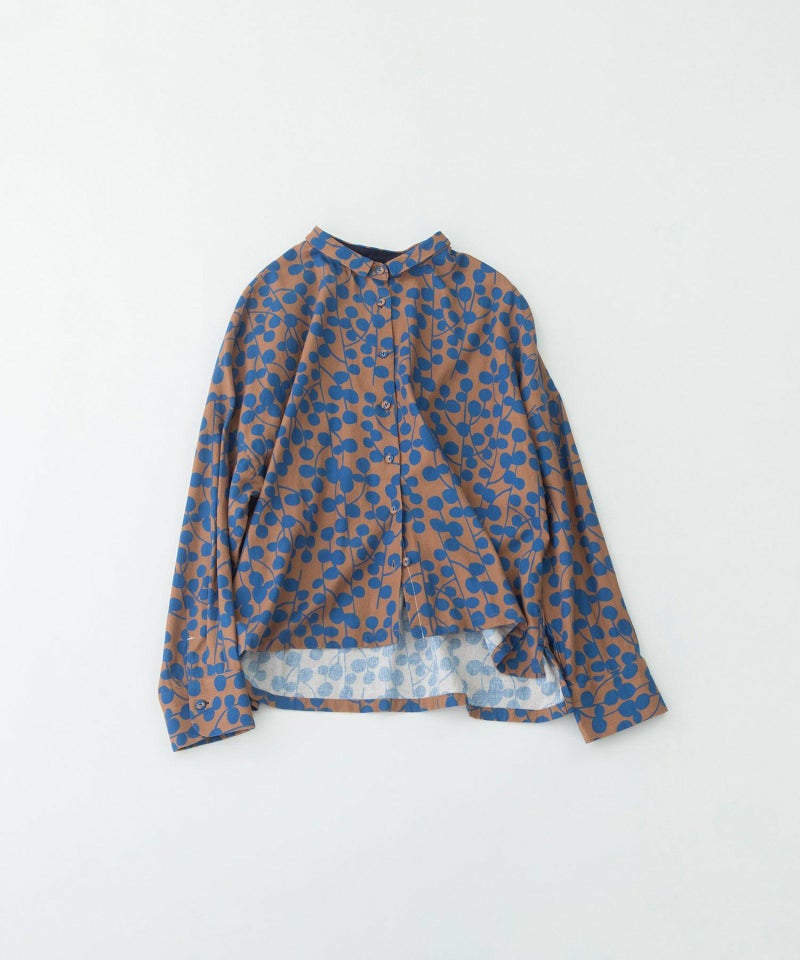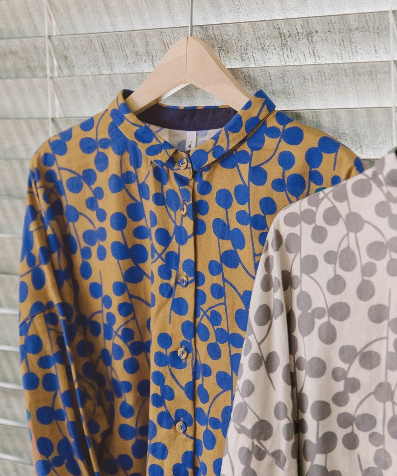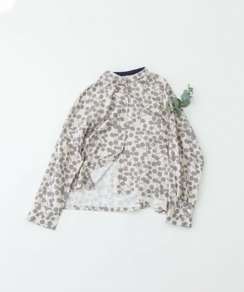 ユーカリモチーフを並べたドット柄の様なオリジナルプリント生地のシャツ。素材はコットンビエラでふんわりと柔らかい手触りが特徴です。短めなワイドシャツで、小さな衿が上品な雰囲気に。後ろが長めの前後差デザインです。第2ボタンホールの配色や、開いた時に見える下前立ての配色ステッチもさりげないポイントです。