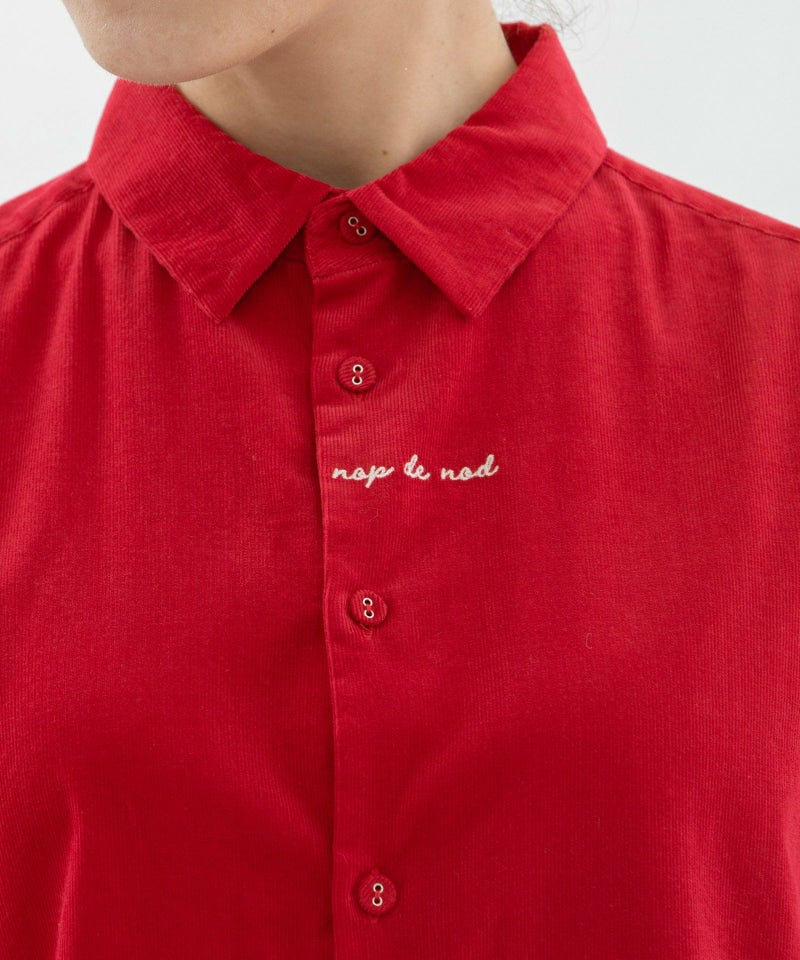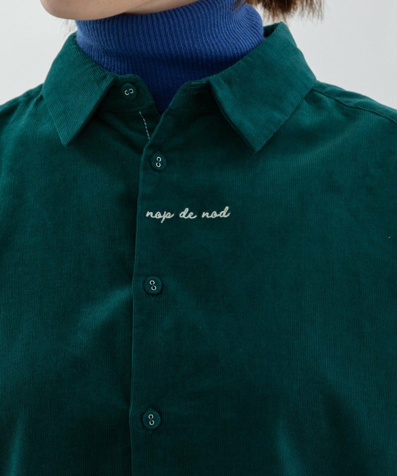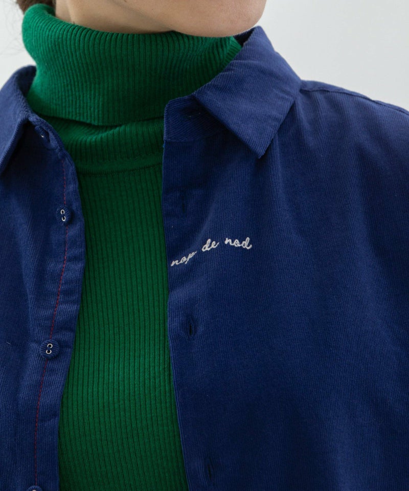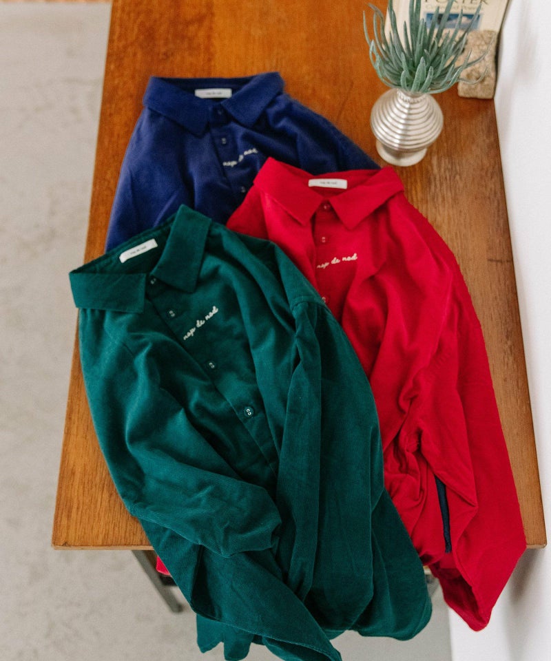 フロントに小さくロゴ刺繍を入れたシンプルデザインのベーシックシャツ。カラーのシャツコールを使用しました。後ろが長めの前後差デザイン、ボタンを開けたときにちらりと見える、下前立ての配色ステッチもさりげないアクセントになっています。