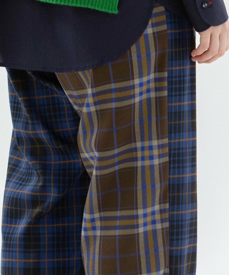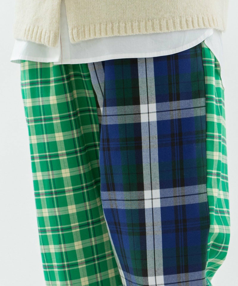 2種類のチェックを使ったリラックスしたシルエットのイージーパンツ。ポリエステルレーヨンの扱いやすい生地を使いました。右後ろにスワンネームでワンポイント。ウエストはゴム仕様・内紐付きでリラックスして履いて頂けます。両サイドポケットつき。
