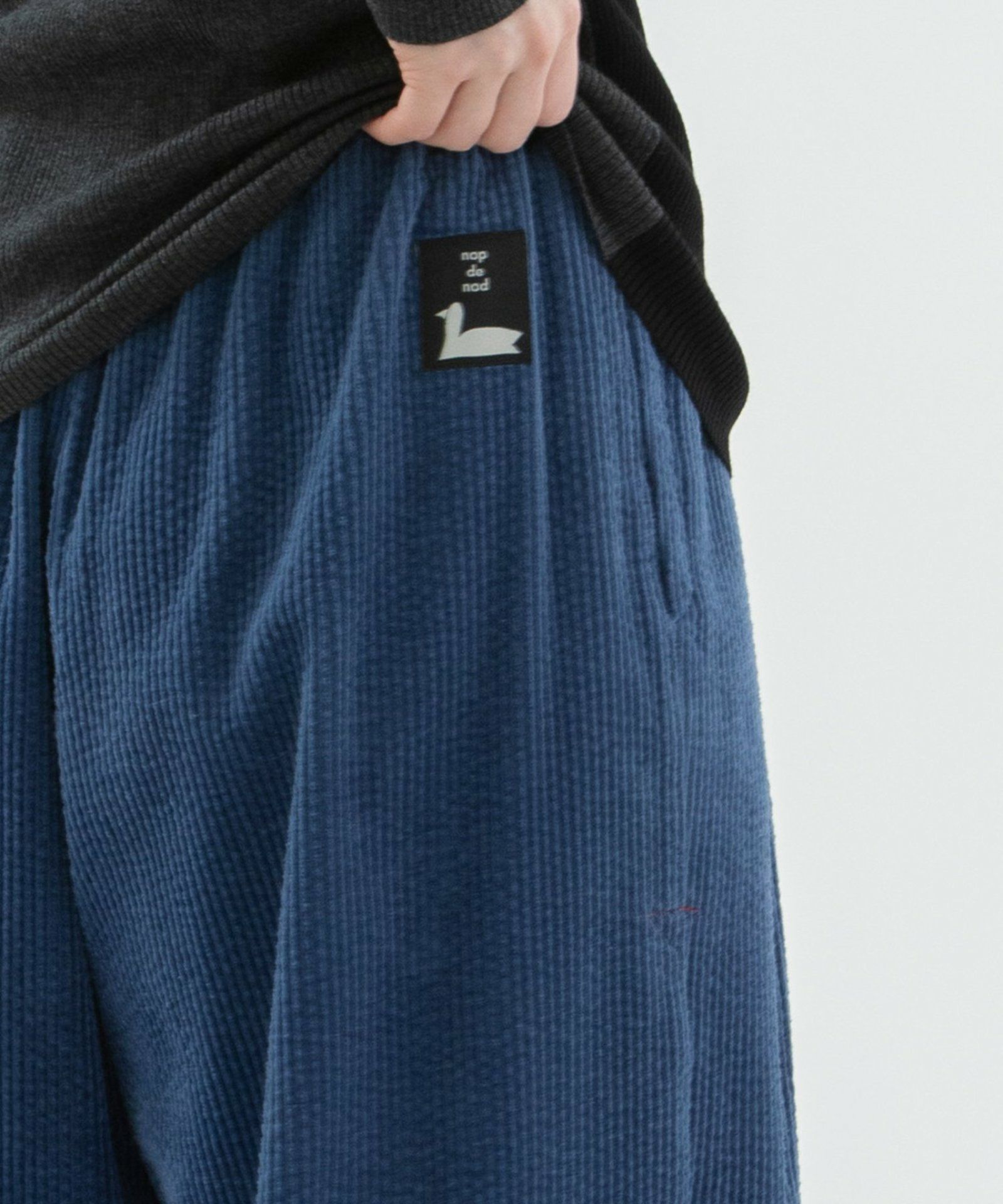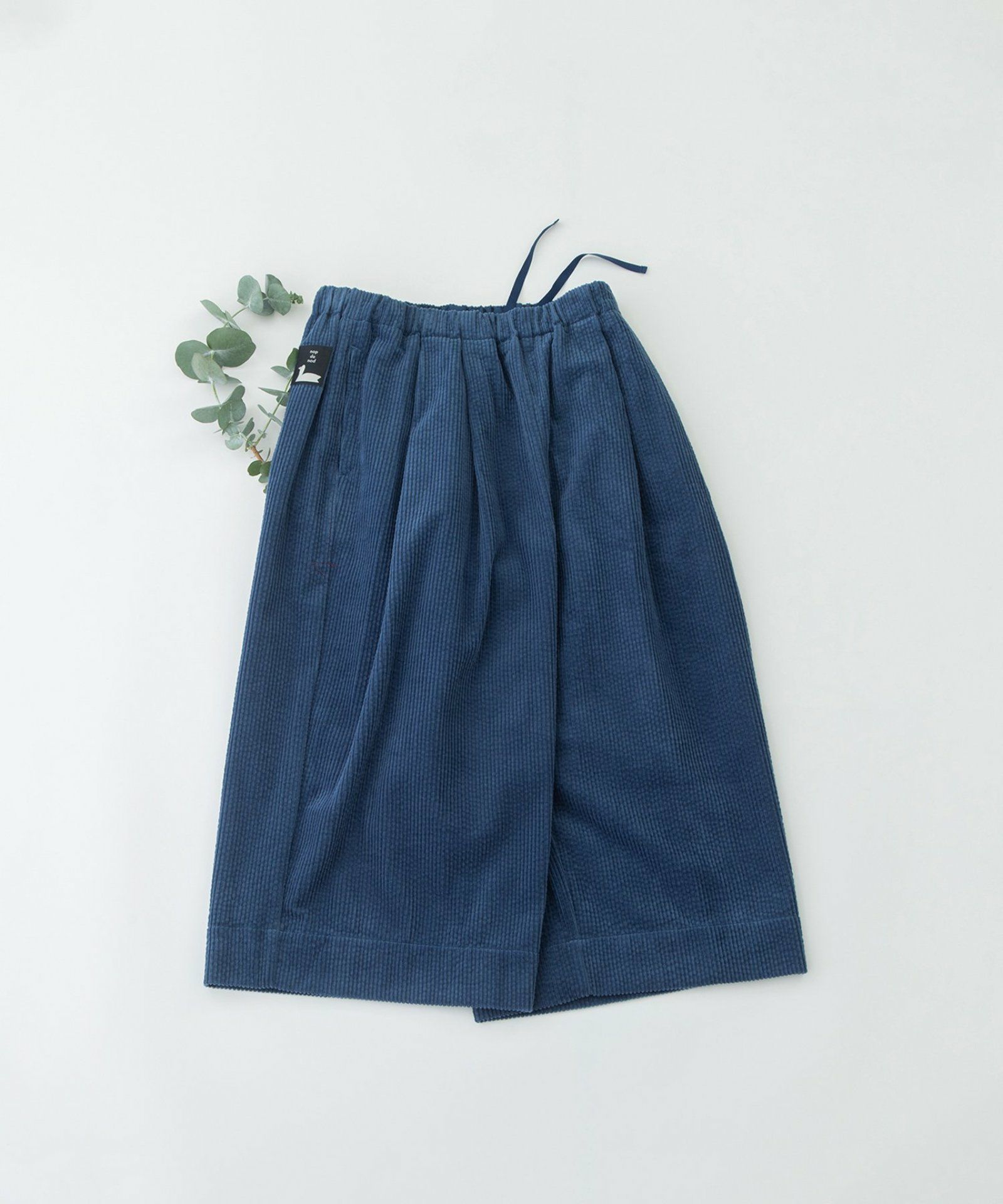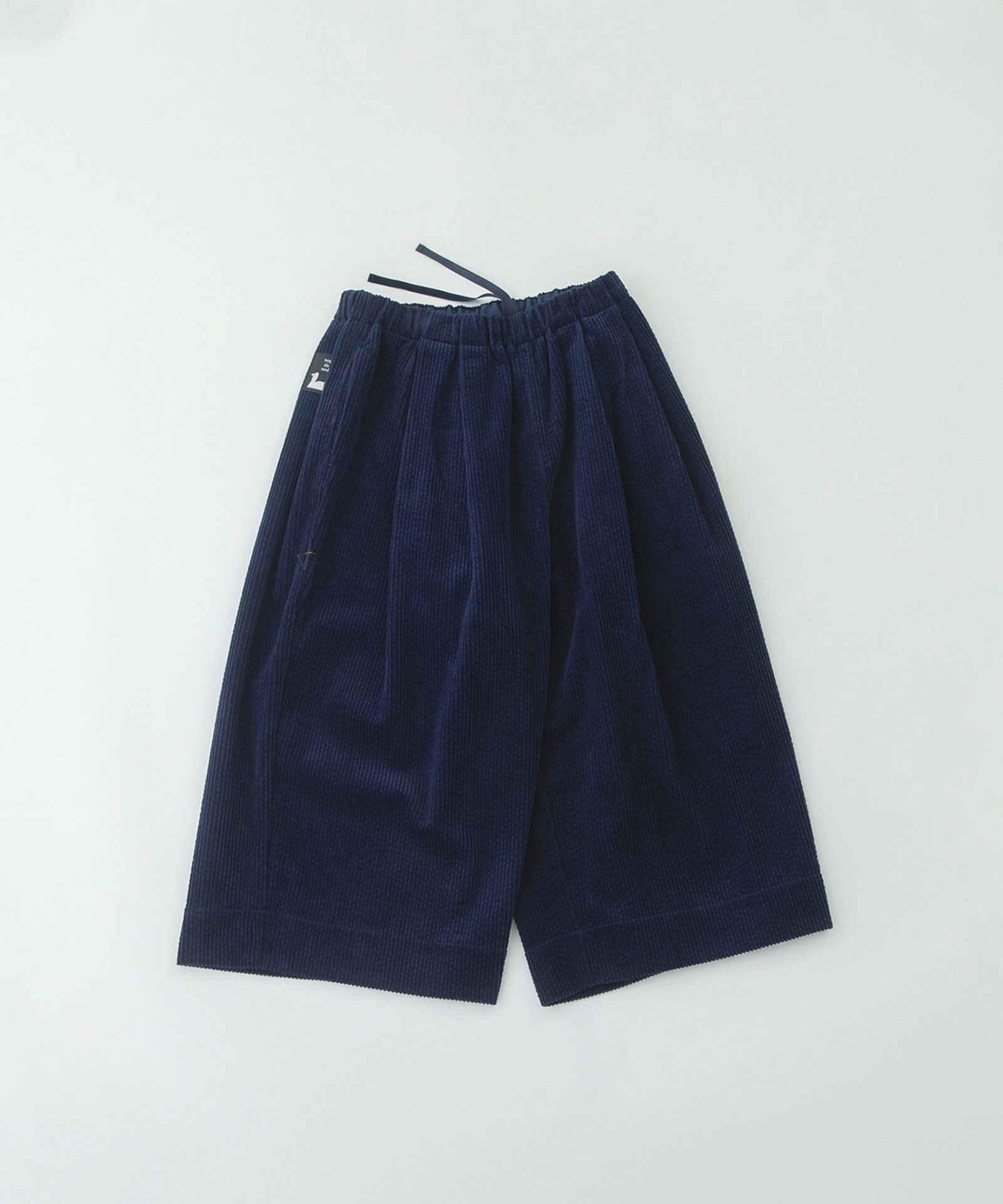 太畝コーデュロイ素材で仕立てたクロップドタックパンツ。フロントのタックから程よく広がるシルエットが絶妙で足首がきれいに見えるバランスです。右後ろのスワンネームがワンポイント。両サイドのポケット口にはスカラップステッチがあり、さりげないアクセントに。ウエストはゴム仕様で内紐つきです。