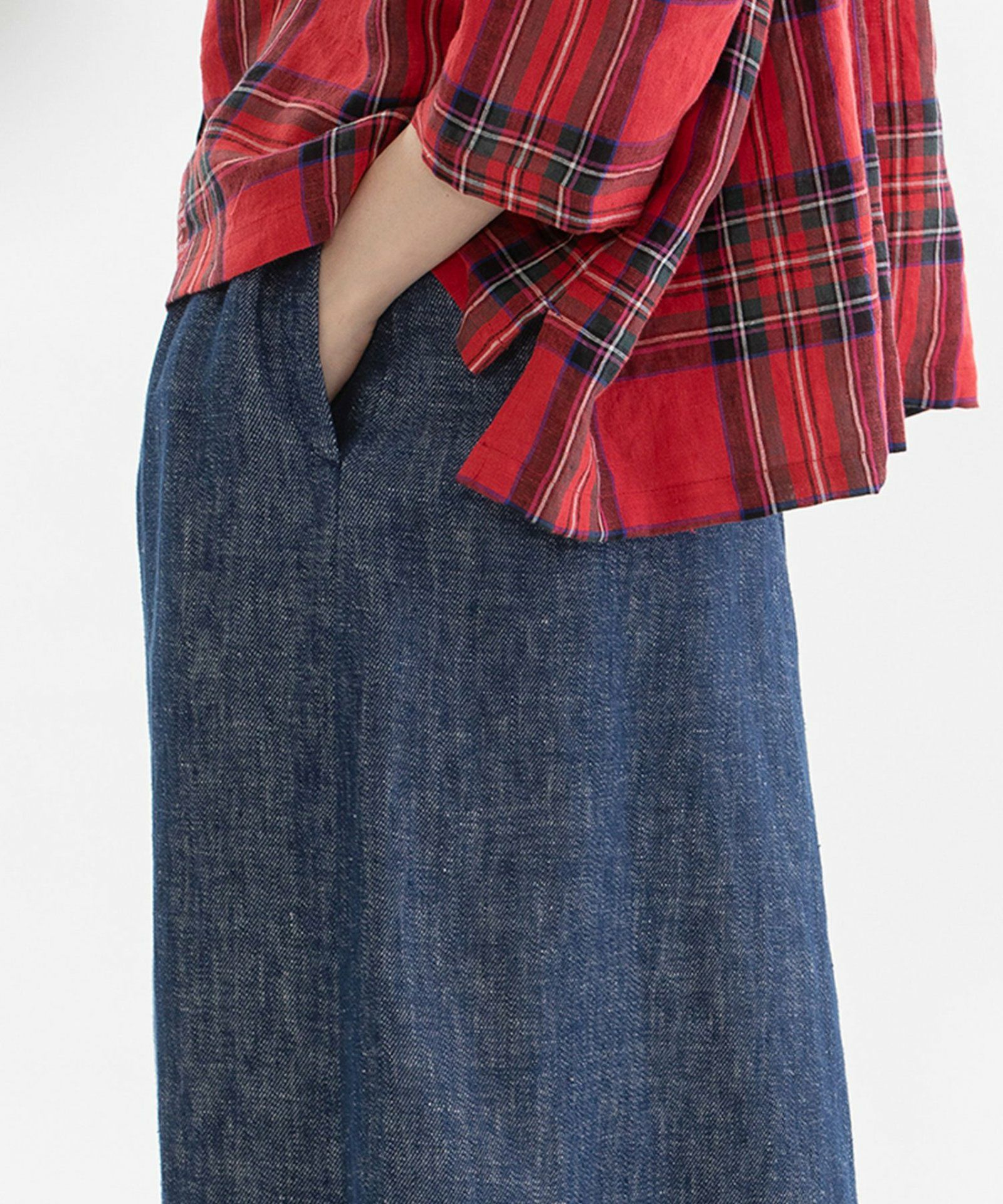 ストンと落ちる、長め丈のフレアスカート。カジュアルにもきれいめにも活躍します。素材は大人っぽいブラックのレーヨンリネンサテンと、リネンデニム風シャンブレーの2種類をご用意しました。ウエストはゴム仕様で内紐付き。両サイドのポケット口にはスカラップステッチが入っています。