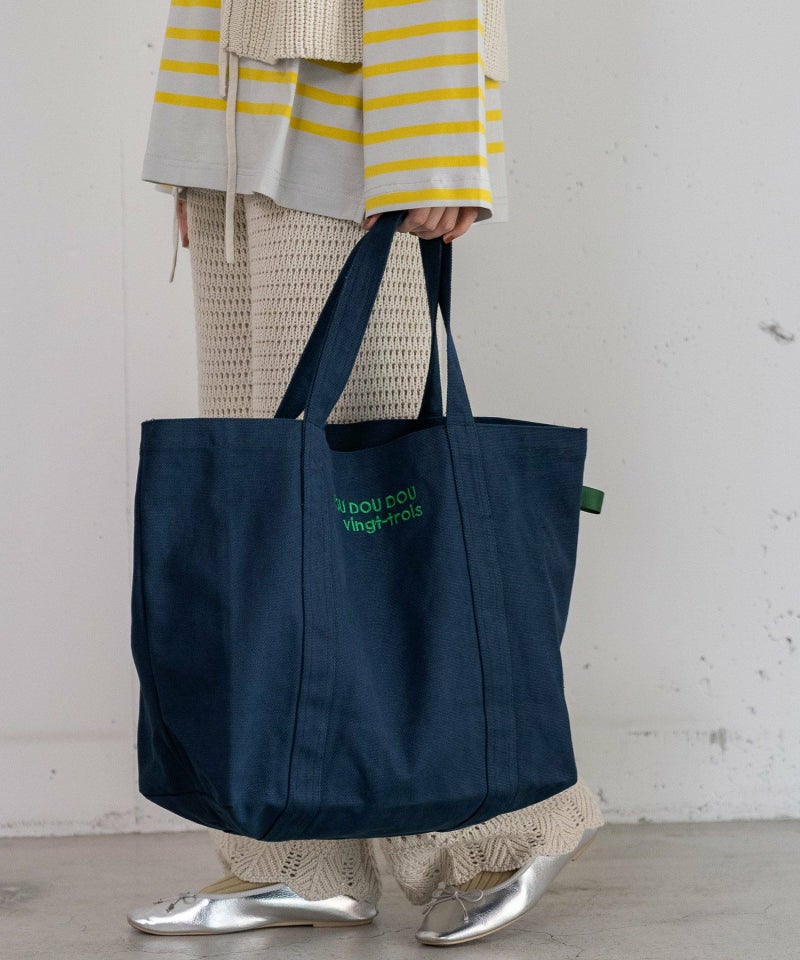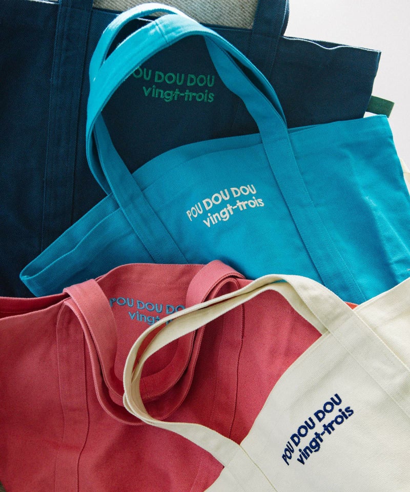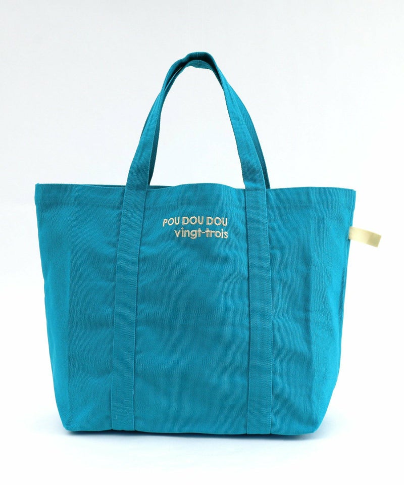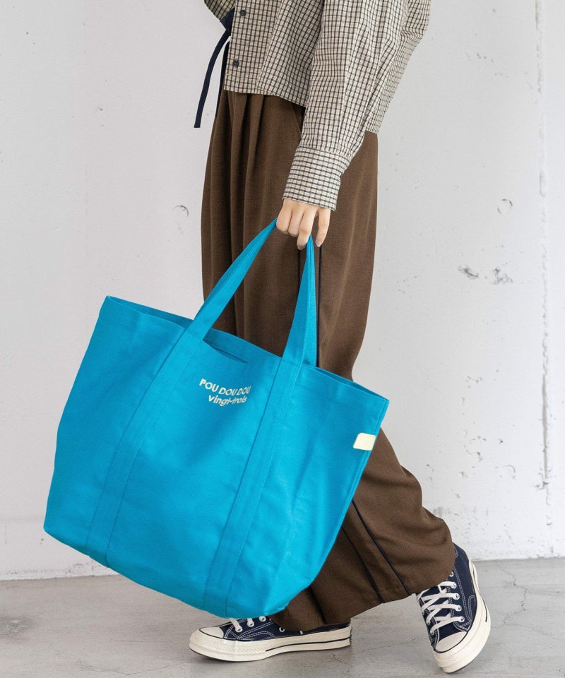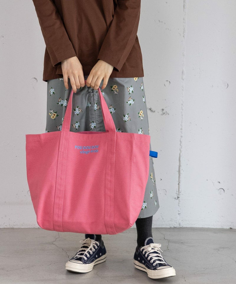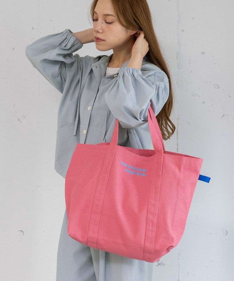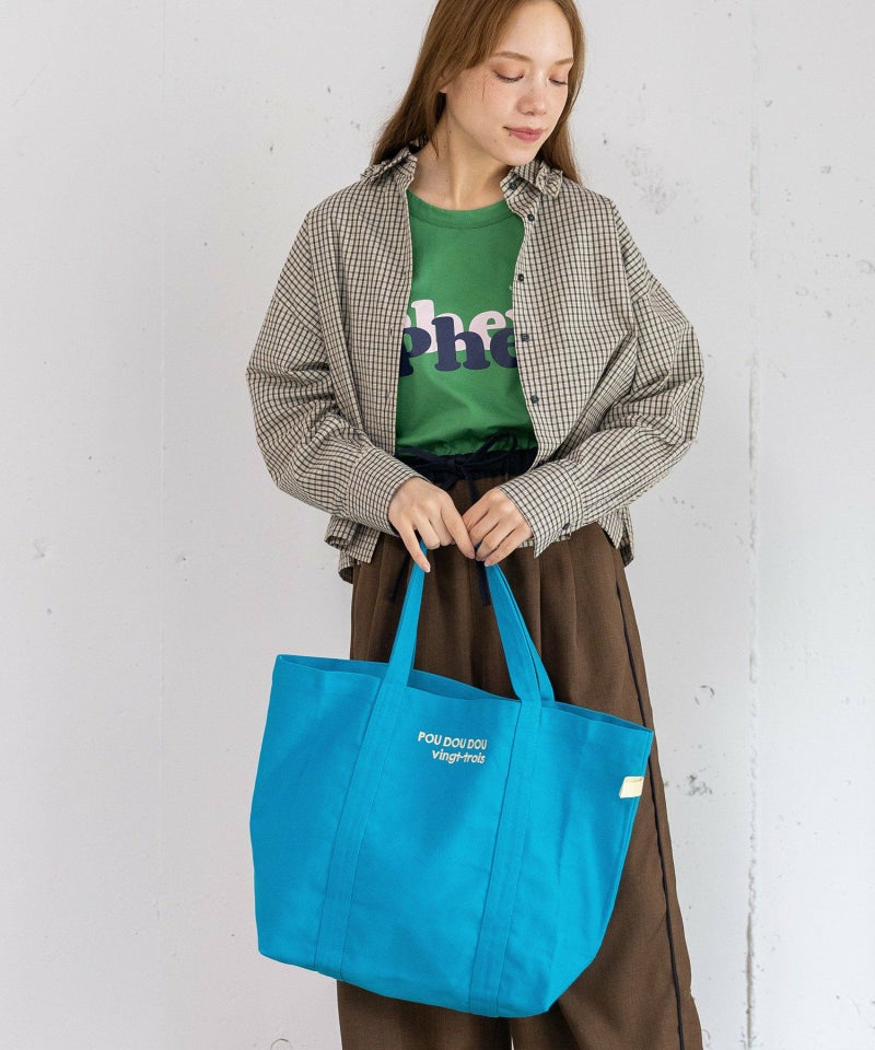 POU DOU DOU vingt-troisブランドロゴ刺繍を入れたオックス素材のトートバッグです。使い込むごとに馴染んで味が出てきます。バッグカラーごとに変えたロゴカラーや脇にはさんだタブがポイント。キーホルダーや缶バッジを付けて自分らしくカスタマイズを楽しめます。反対側と内側にポケットをつけました。