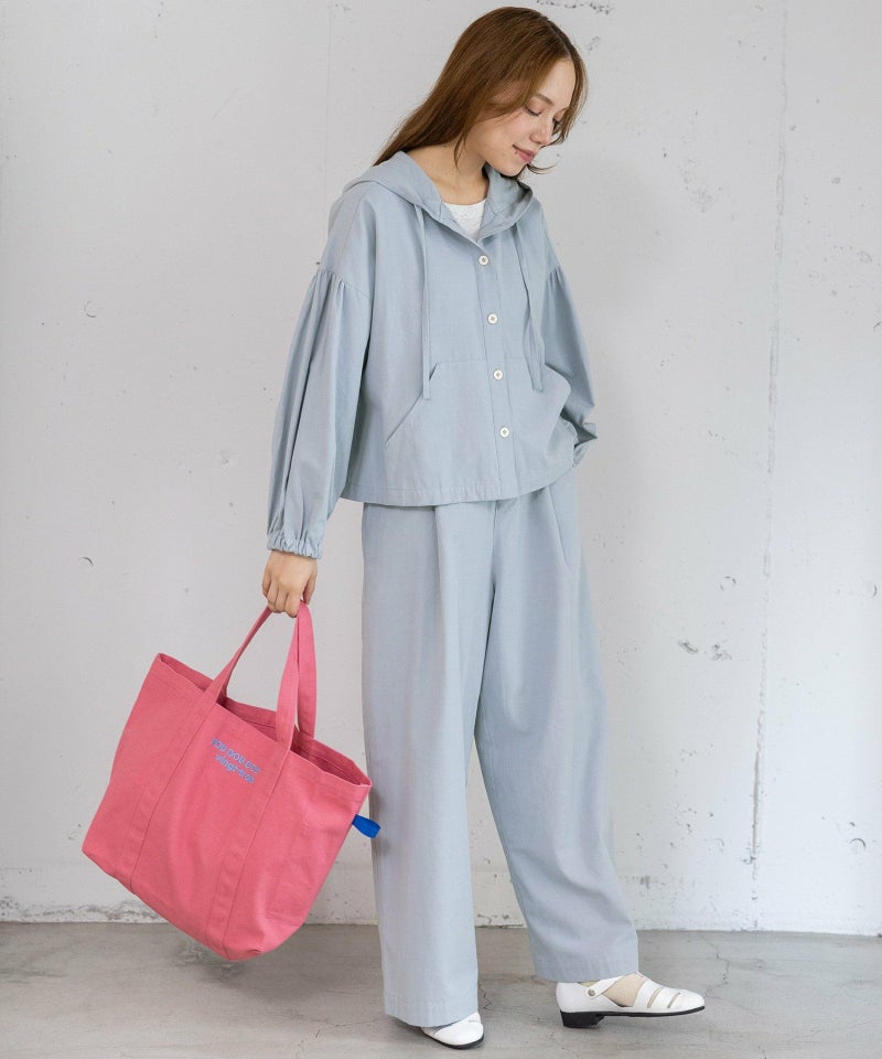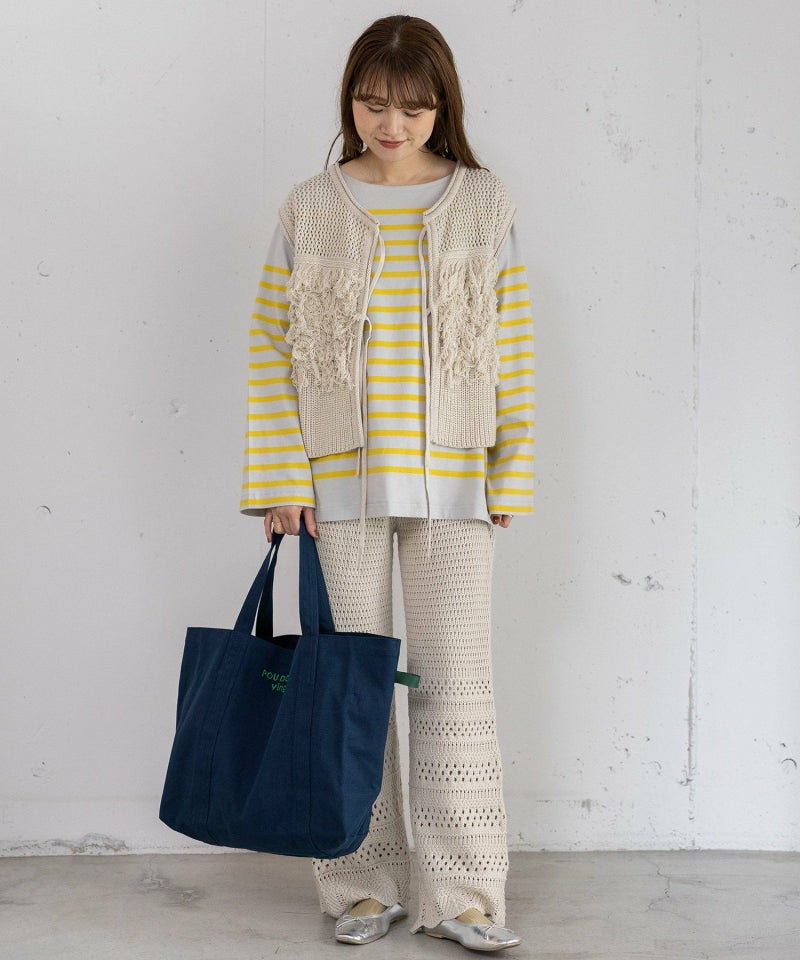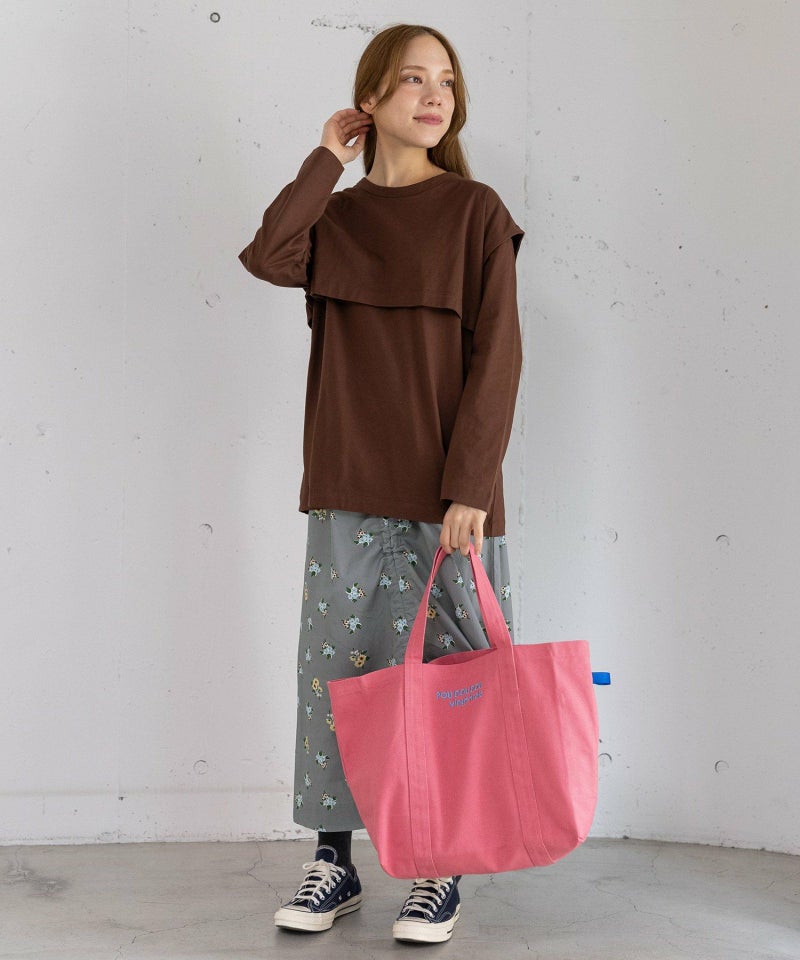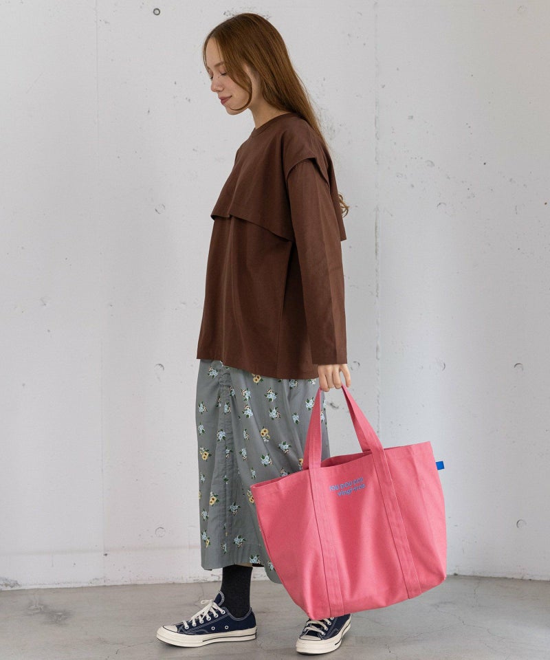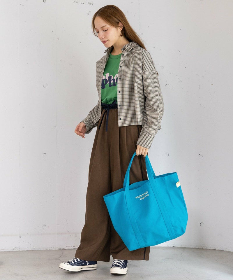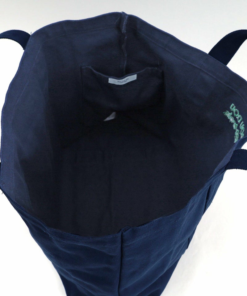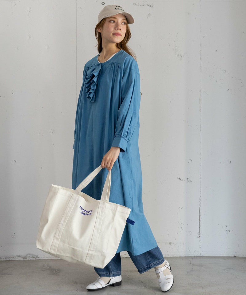POU DOU DOU vingt-troisブランドロゴ刺繍を入れたオックス素材のトートバッグです。使い込むごとに馴染んで味が出てきます。バッグカラーごとに変えたロゴカラーや脇にはさんだタブがポイント。キーホルダーや缶バッジを付けて自分らしくカスタマイズを楽しめます。反対側と内側にポケットをつけました。