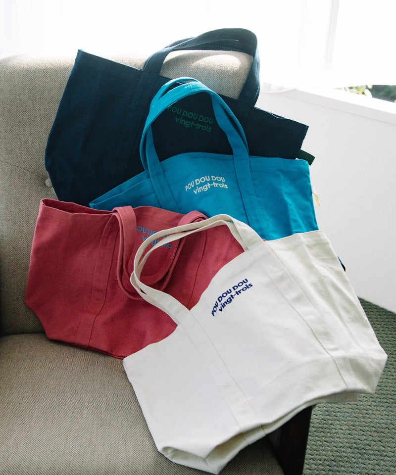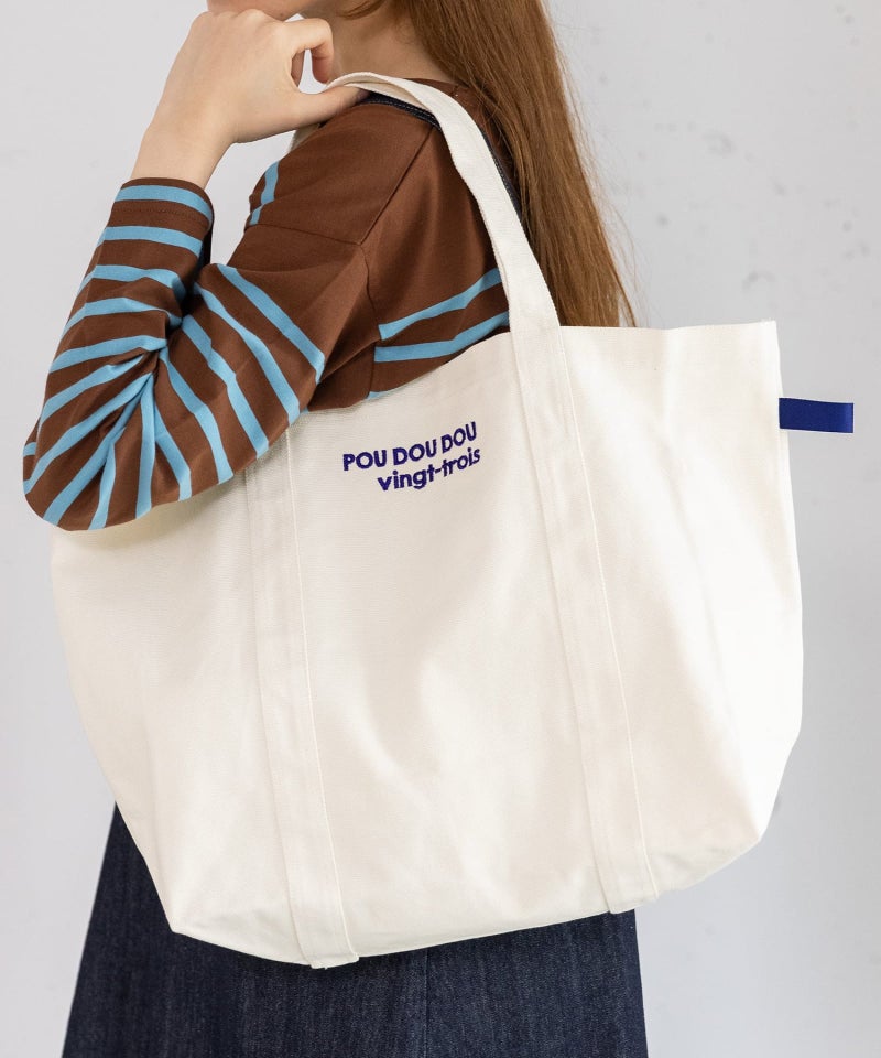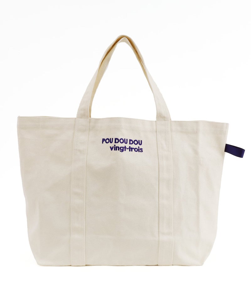 POU DOU DOU vingt-troisブランドロゴ刺繍を入れたオックス素材のトートバッグです。使い込むごとに馴染んで味が出てきます。バッグカラーごとに変えたロゴカラーや脇にはさんだタブがポイント。キーホルダーや缶バッジを付けて自分らしくカスタマイズを楽しめます。反対側と内側にポケットをつけました。