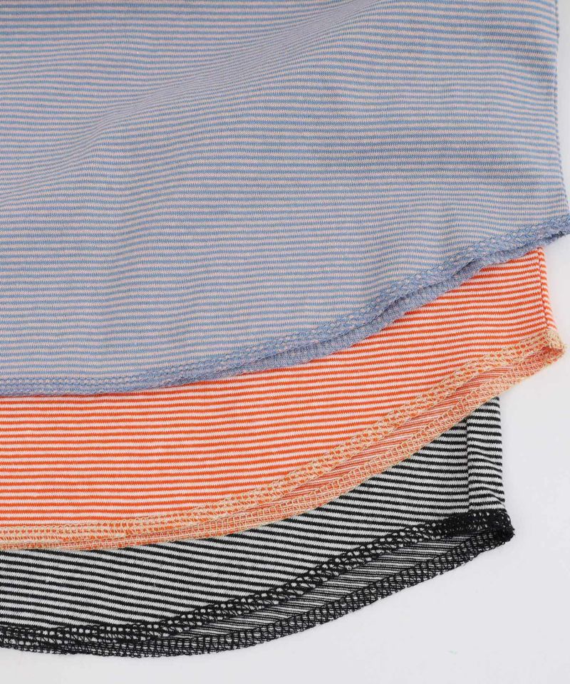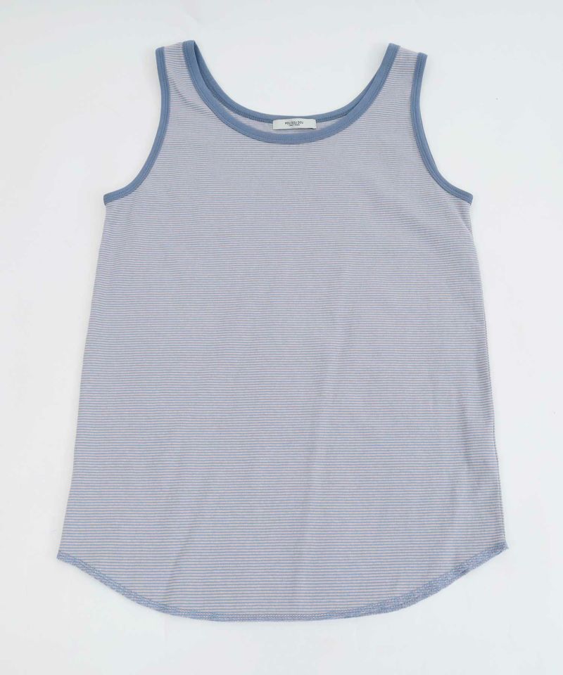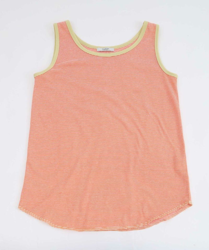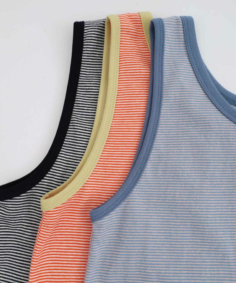 ・細ピッチのカラーボーダーに、アクセントカラーのパイピングが効いたタンクトップ。