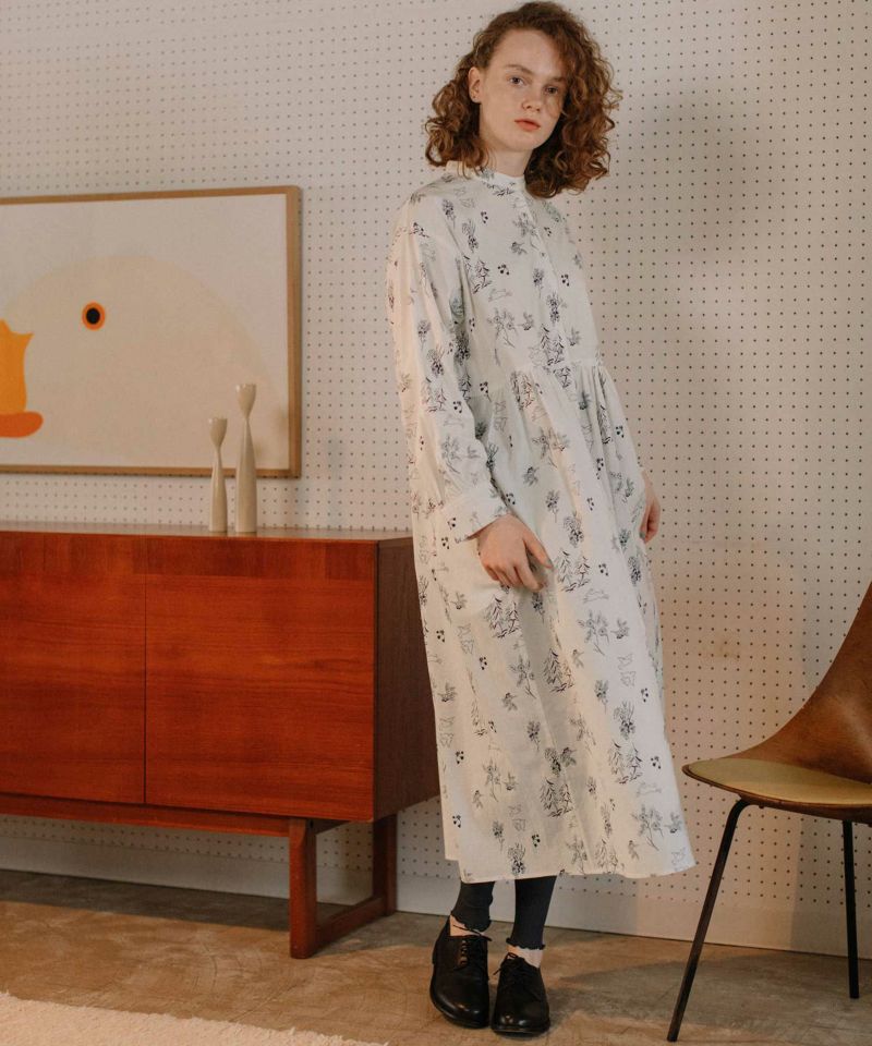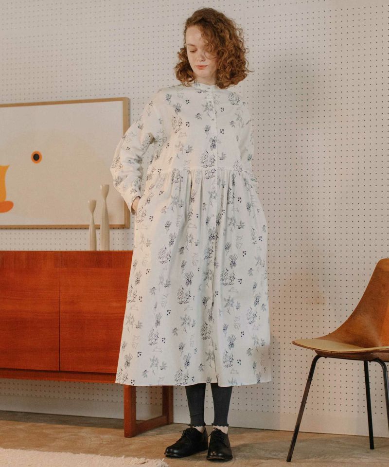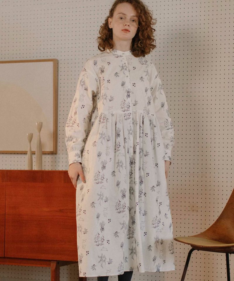 ・ワイルドフラワーや野いちご、鳥とうさぎのモチーフをちりばめたオリジナルプリントのブラウス。遠くで見るとストライプ状に並んでいます。