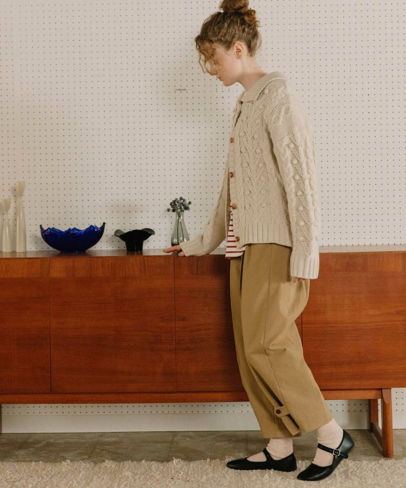 ・センタープレスできちんと感がありつつ、ケーブルニットやカジュアルなスウェットなどとも好相性の汎用性のあるパンツ。