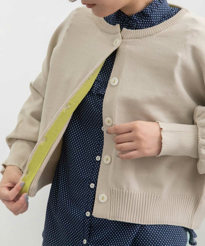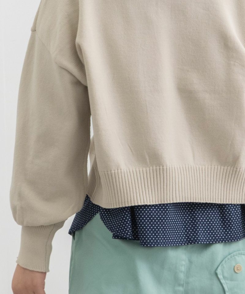 ・とても軽いポリエステル素材の糸で編み立てたカーディガン。ぷっくりとした袖と短めの丈感がシンプルながら新鮮な雰囲気です。