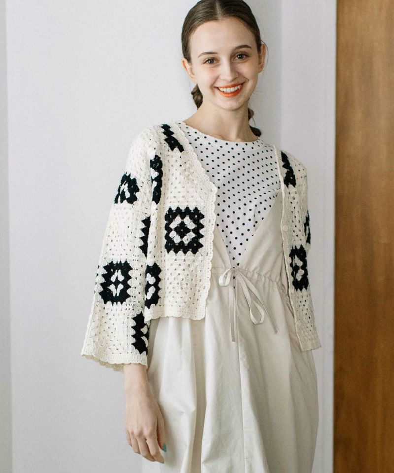 ・かぎ針で編み立てたようなカーディガン。パッチワーク柄と、カラー展開によって異なる配色がポイント。バランスのとりやすいクロップド丈です。