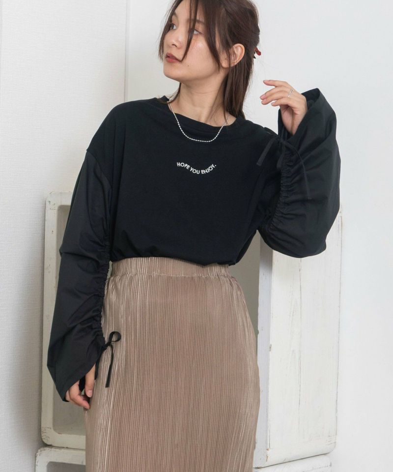 ・トレンドのシャーリングディティールを袖に取り入れたカットソー×布帛トップス。袖口を絞れば袖の形がカーブしてボリューム感のあるデザインになります。