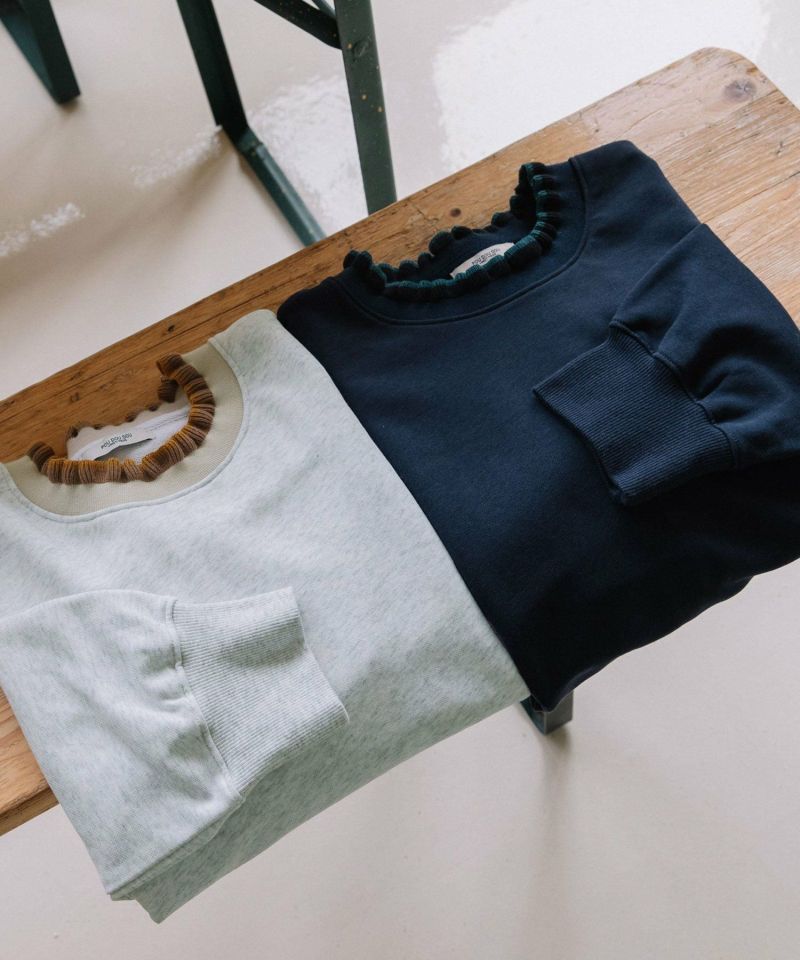 空気の力で撚り合わせる空紡糸を、裏毛組織にすることでボリューム感とシャリ感を表現しました。定番のニットフリルがアクセントになったプルオーバー。ニットフリルはちびフリルで編み立て、配色も効かせています。袖口と裾はリブになっているのでカジュアルなアイテムと相性抜群◎プードゥドゥらしい一癖あるアイテムとして、普段のコーディネートに遊び心をプラスできる1枚です。