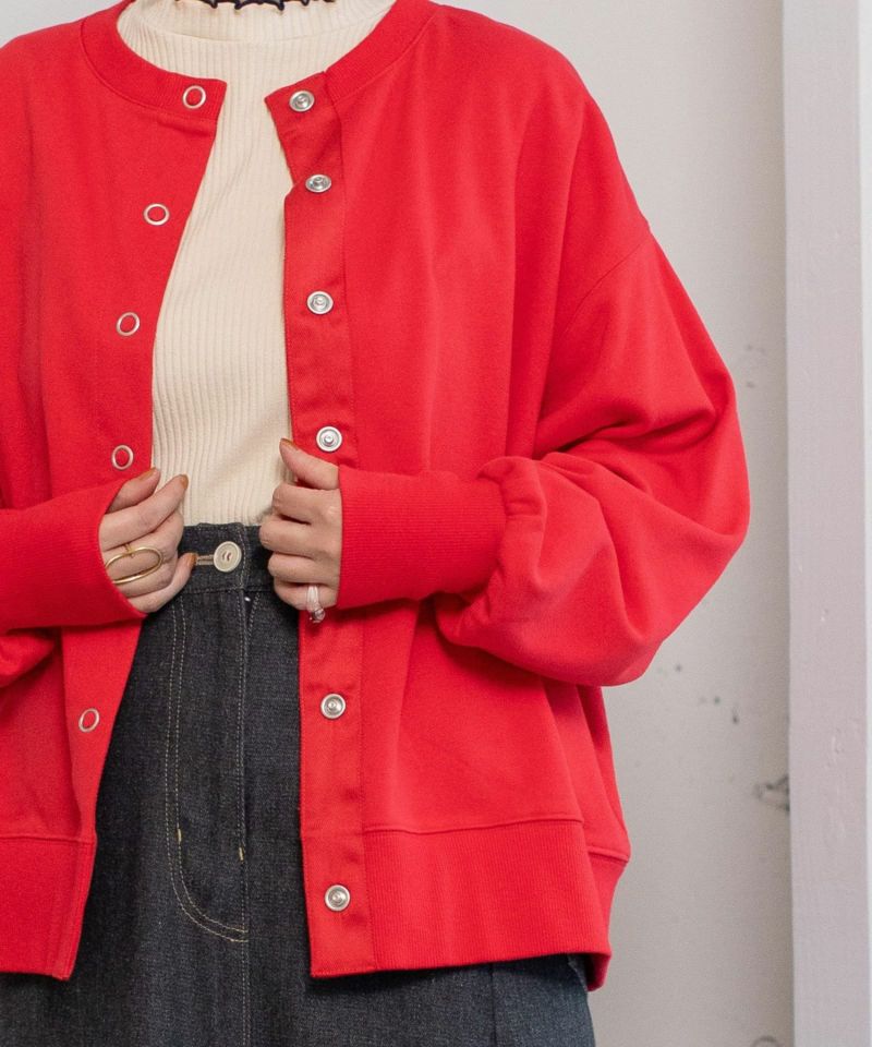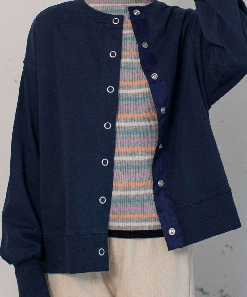 ゆったりとしたシルエットのカーディガン。空気の力で撚り合わせる空紡糸を、裏毛組織にすることでボリューム感とシャリ感を表現しました。主役トップスとしても羽織りものとしてもロングシーズン活用できる万能アイテム。しっかりとした生地感なので、ライトアウターのような感覚でもお召し頂けます。