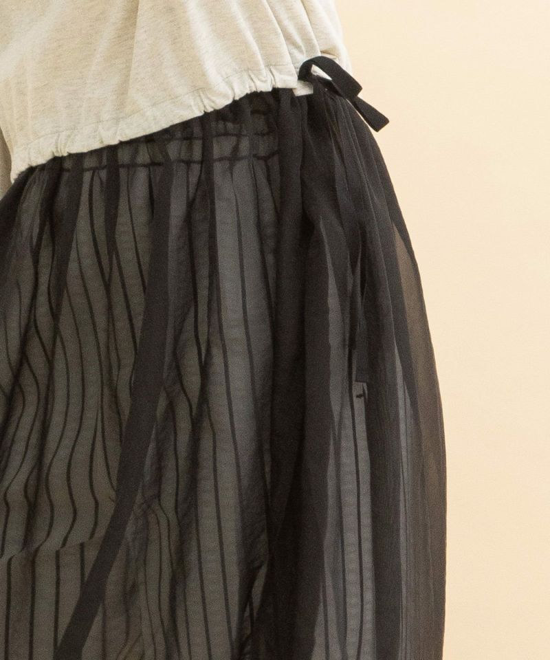 カットソー素材とシアー感のあるオーガンジーをドッキングしたワンピース。首回りはクルーネックでスッキリとしたデザイン。ウエスト周りはゆったりと、リボンを通しているのでお好みのサイズ感で着用いただけます。