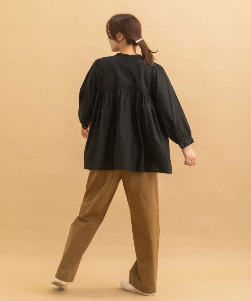・花モチーフのエンブロイダリー生地を切り替えたふんわりギャザーのブラウス。小ぶりなスタンドフリルが上品な雰囲気です。