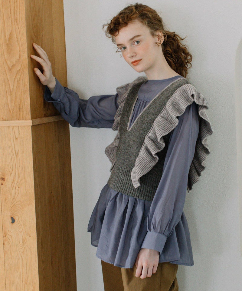 ・ティアード切り替えとギャザーのふんわりとした揺れ感が目を惹く透け感のあるブラウス。