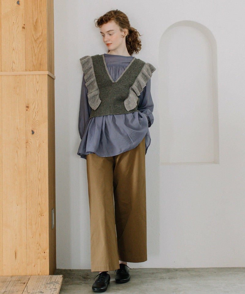 ・薄手の素材でベストなどのレイヤードスタイルも合わせやすい。