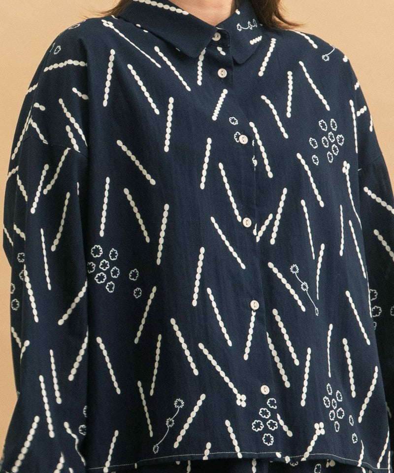 ・楕円を繋げたモチーフやポップコーンがはじけたような柄を飛ばした単色のオリジナルプリント。金平糖のようにもみえるので、konpeitoプリントと名付けました。アートっぽさ、ストリートっぽさを出しています。