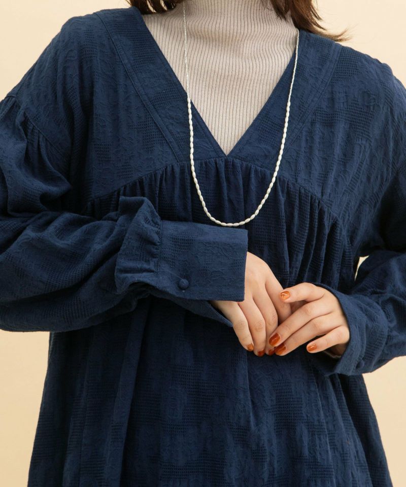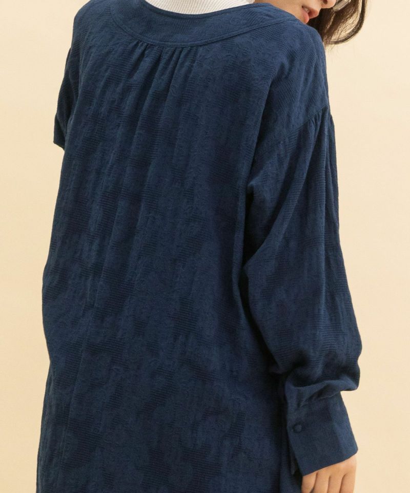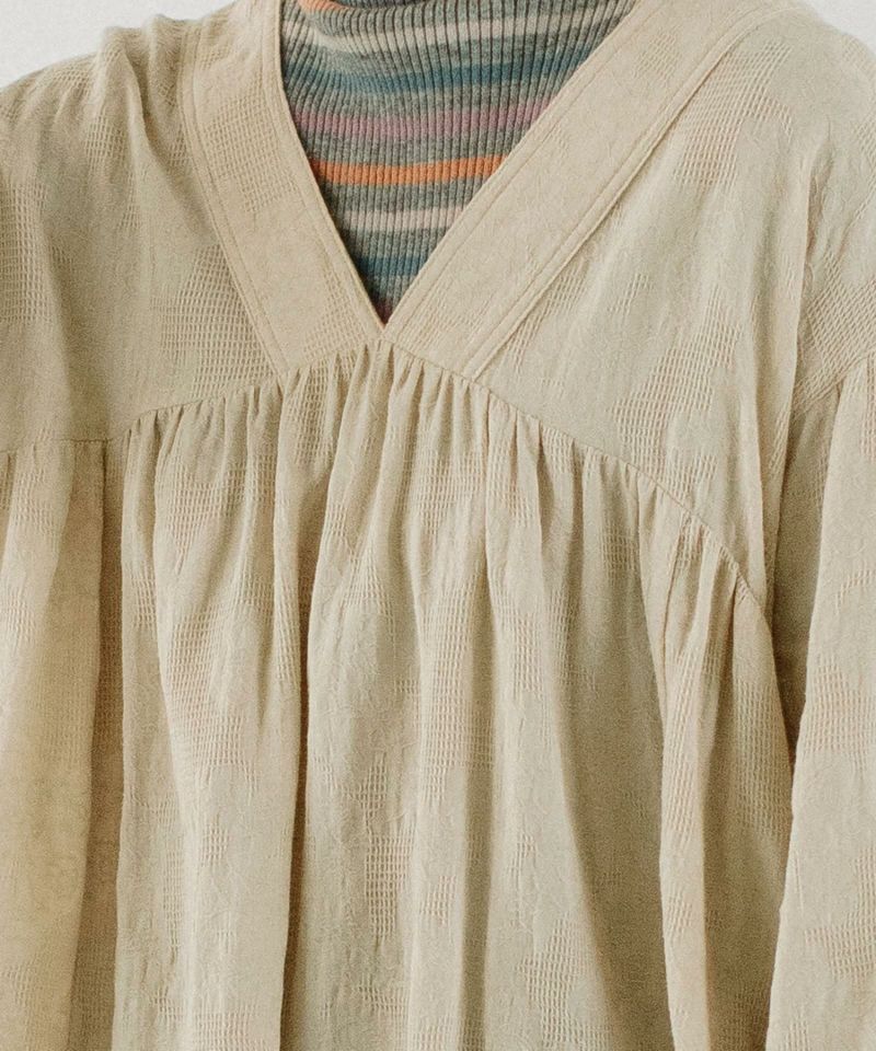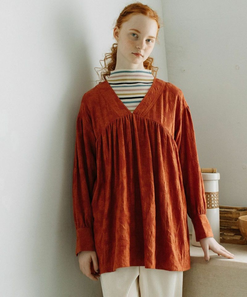 ボタニカル柄のジャガード生地を使用したチュニックブラウス。無地のように見えながらさりげなく華やかさのある生地で仕立てました。首元きれいに見えて、ハイネックのニット合わせもすっきりと決まるVネックデザイン。身頃と袖にギャザーを寄せて立体感を出しました。ボリュームのあるシューズとも相性の良いブラウスです。