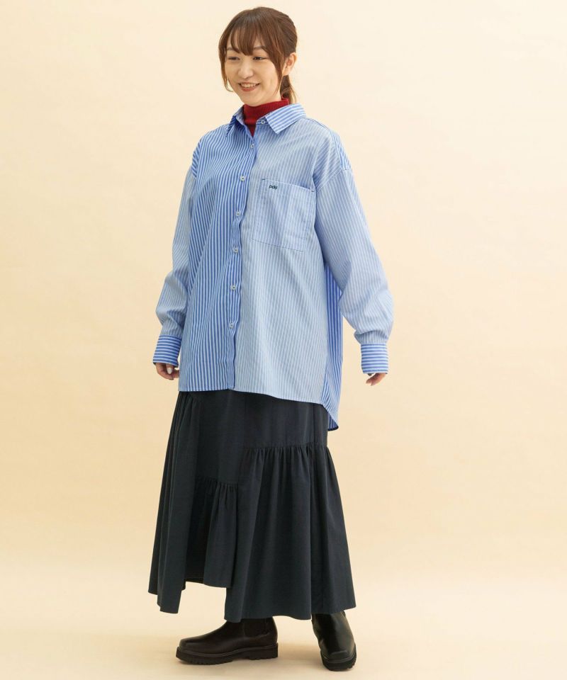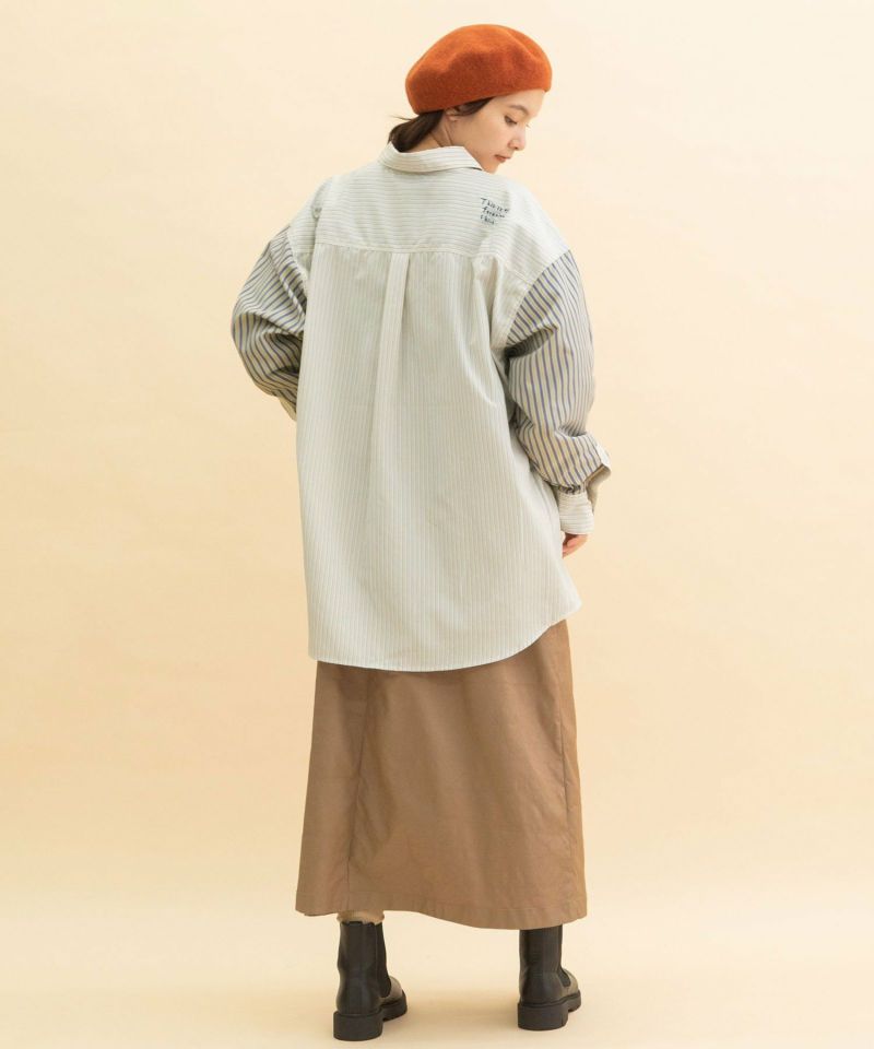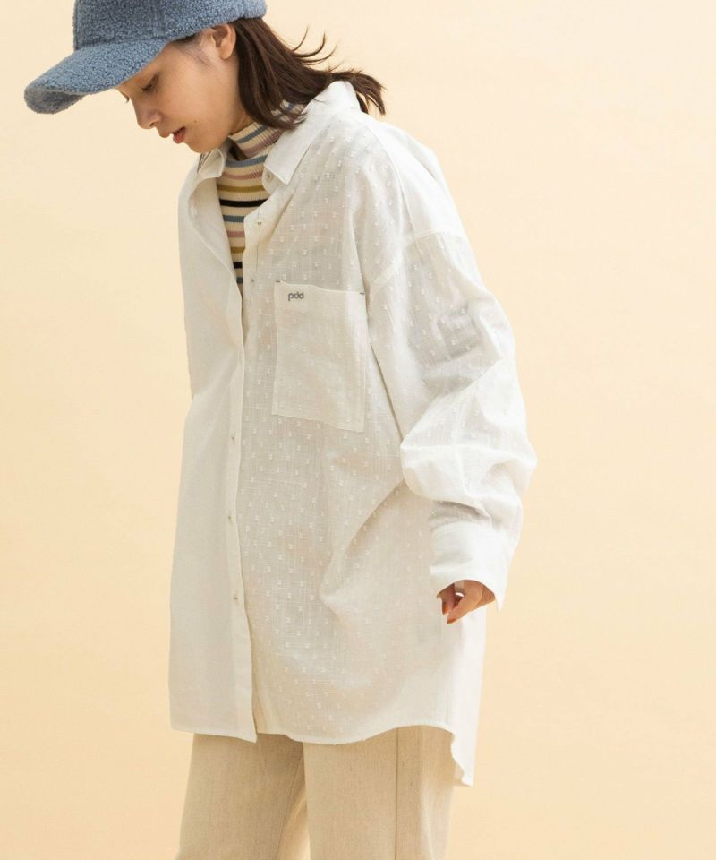 2種類の素材を掛け合わせたオーバーサイズのシャツ。ベーシックな形ながらもトレンドライクなサイズ感が嬉しい。フロントポケットにpdd、後ろヨークにもメッセージ刺繍入り。細かいところにもPOU DOU DOUらしい遊び心をプラスしたデザインです。