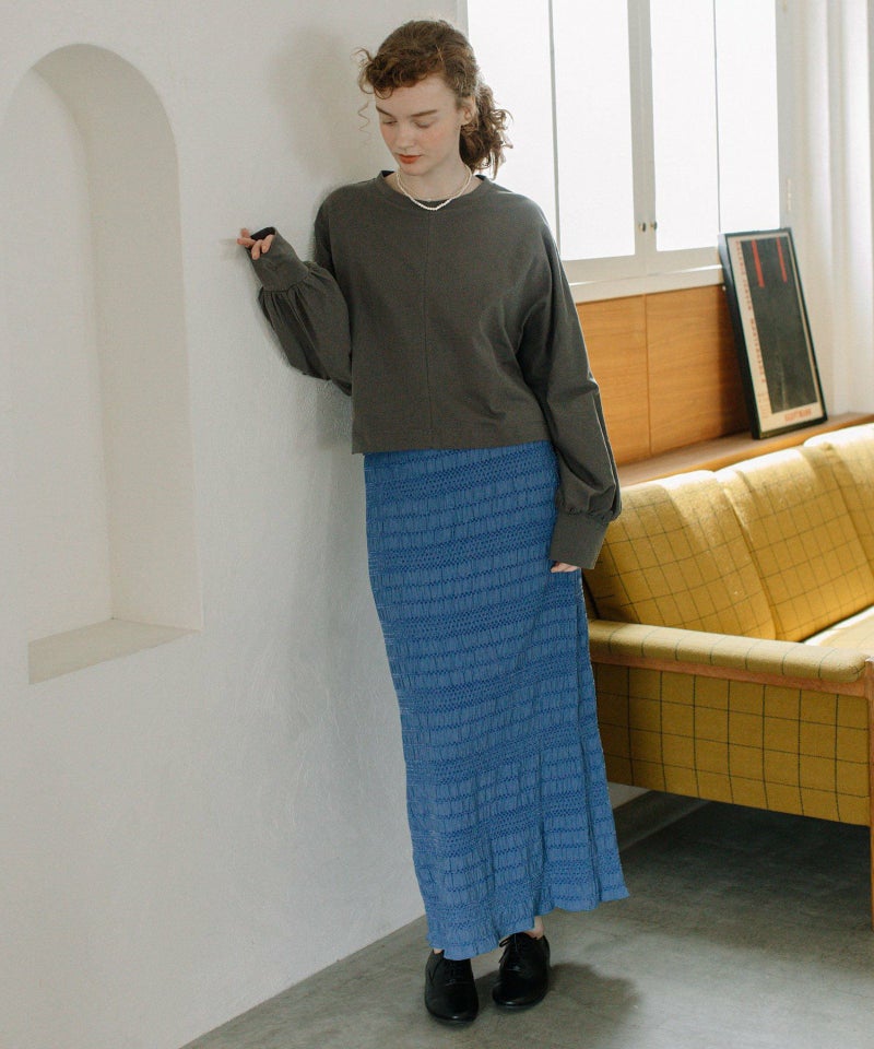 ・モールステッチのシャーリングが特徴的な生地を使用した、しなやかな女性らしいシルエットのスカート。