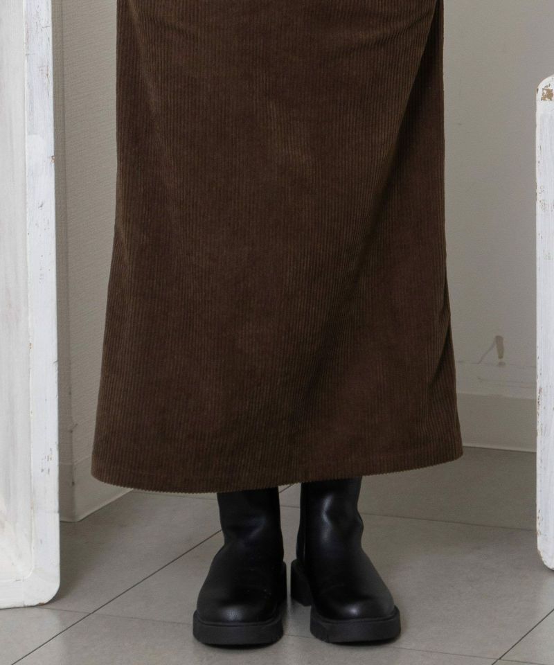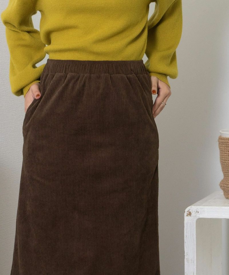 暖かみのある、なめらかな肌触りのコーデュロイ素材を使用したスカート。伸縮性のある素材とウエストゴム仕様で楽な履き心地です。体のラインを拾い過ぎないナローシルエットが女性らしい着こなしを演出します。ウエスト紐で調整が可能、両サイドポケットつき。