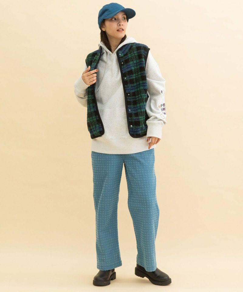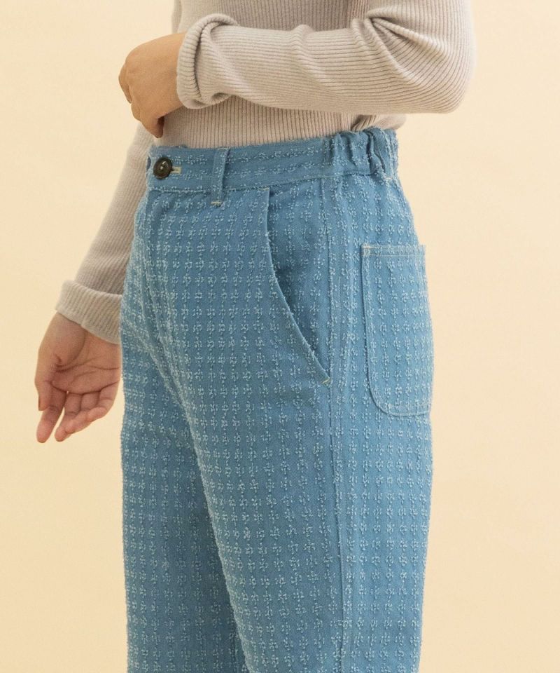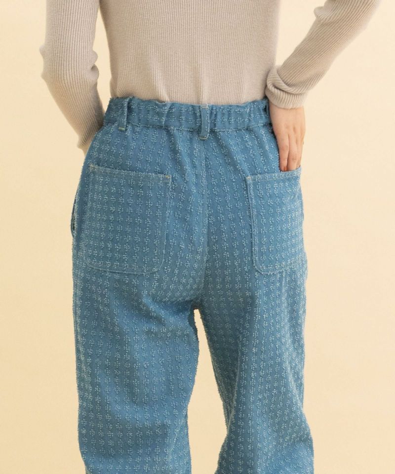 パンチング(穴あき)加工が施されたデニム生地を使用したストレートパンツ。トレンド感があり、いつものデニムコーデに鮮度をプラスしてくれます。後ろウエストはゴム仕様で楽に履いていただけます。両サイドとバックの4ポケット。