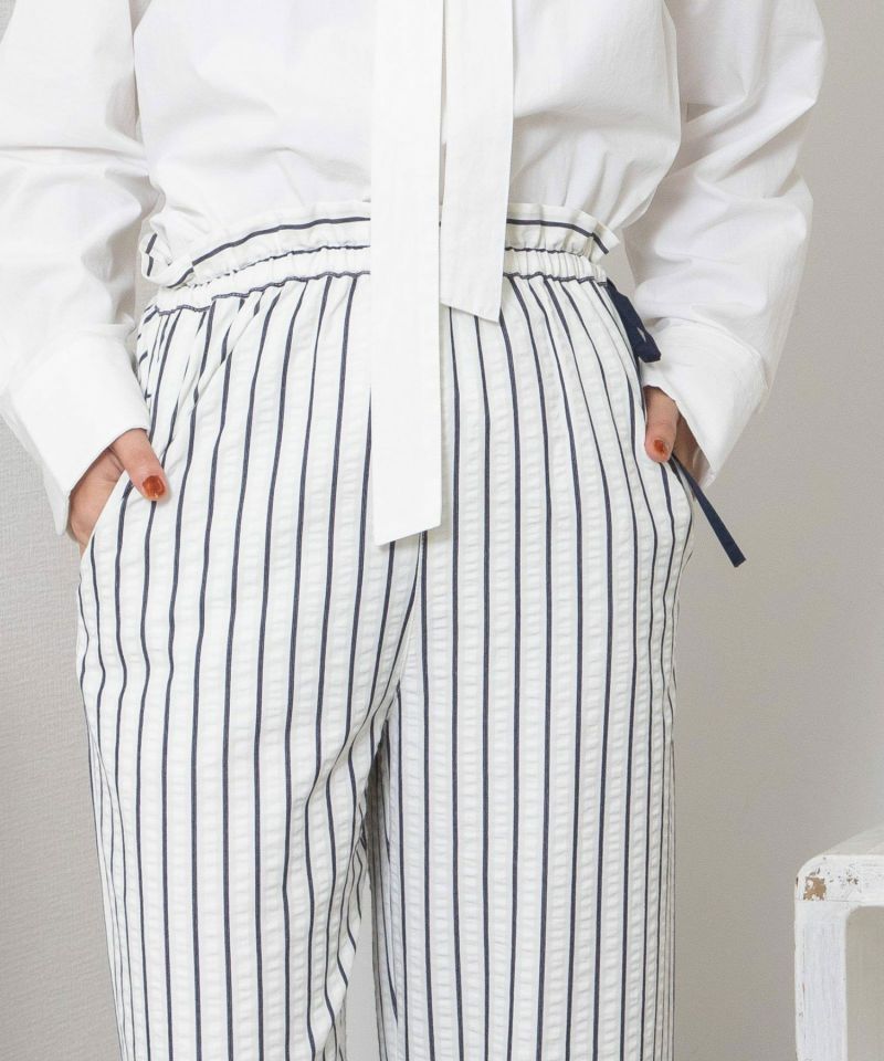 凹凸のある表面のストライプ生地を使用したイージーパンツ。裾にはパイピングテープを挟み込み、リラックスした雰囲気をプラスしました。ウエストのフリルやサイドのリボンもトップスインした時のアクセントに。ぐるりとゴムのウエストで楽に履いて頂けます。
