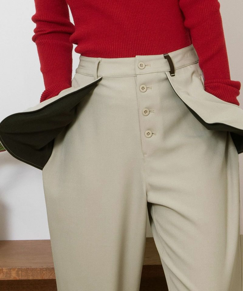 大きなアウトポケットが印象的なコクーンパンツ。ポケットは身頃に縫い付けずに浮かせて立体感をだしています。ヒップまわりにゆとりを持たせたカーブラインがきれいで足首まわりもスッキリと見えます。ポケットの裏側やベルトループの一部を配色にして遊び心をプラス。ストレッチ混で伸縮性のある素材を使用し、少しキレイめで大人な雰囲気に仕上げています。後ろウエストはゴム仕様で楽な履き心地です。