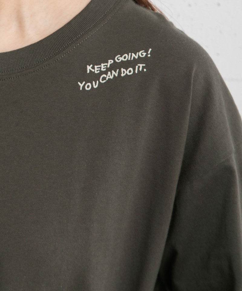 程よい張りとシャリ感が着心地の良いUSAコットンのロンTee。目の詰まったしっかりとした生地は、着込んでいく程に風合いよく、肌に馴染んでいくのも特徴です。ゆったりとしたサイジングで、長めの袖はくしゅっとさせて着るのがオススメ◎ポジティブなロゴ刺繍を衿元に入れているのがポイントです。刺繍:KEEP GOING! YOU CAN DO IT. =がんばれ!あなたならできる!というメッセージ