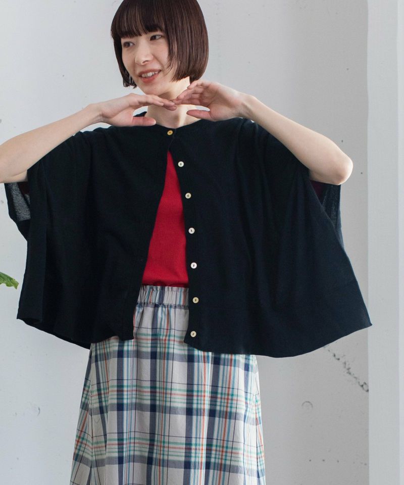 ケープのようなデザインカーディガン。抜け感のある短めの着丈に、たっぷりとしたリラックス感のあるシルエット。サイドの開きが気にならないよう袖下は綴じた仕様にしています。ボタンを留めてプルオーバーとしての着用もおすすめです。清涼感のある、軽くさらっとしたタッチのコットンで、シーズンの変わり目や冷房対策にもご活用いただけるアイテムです。