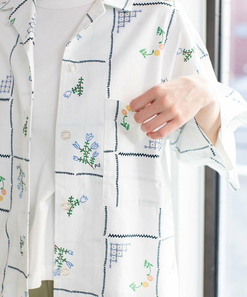 アンティーククロス風のステッチイラストをプリントしたオリジナルのテキスタイル。メンズライクな開襟シャツがデザインソースのオープンカラーシャツ。ボタンを上まで留めるとフラットカラーにもなります。いつもより少し大きめのボタンと左胸ポケットがさりげないポイント。羽織としても使えます。