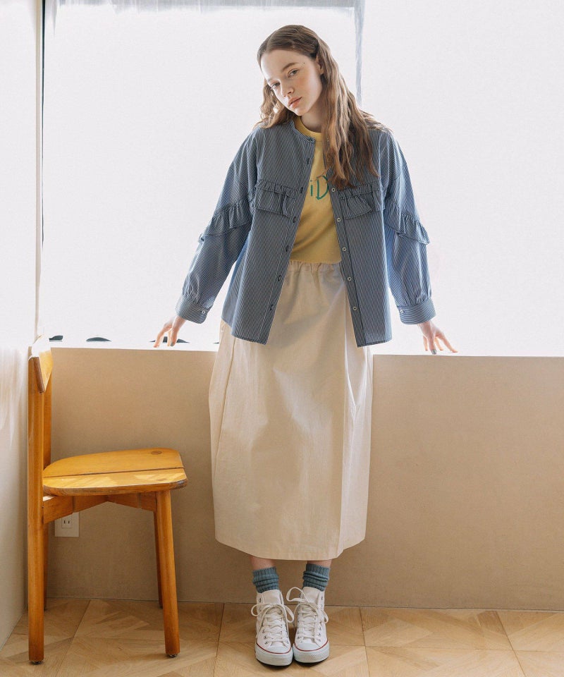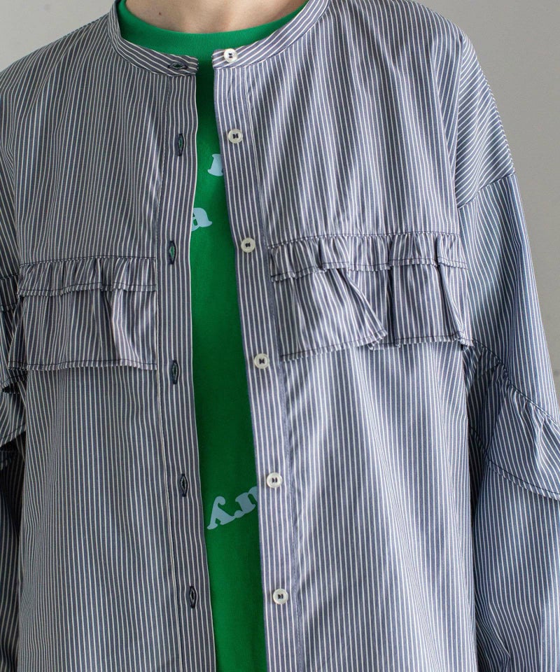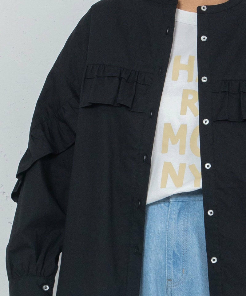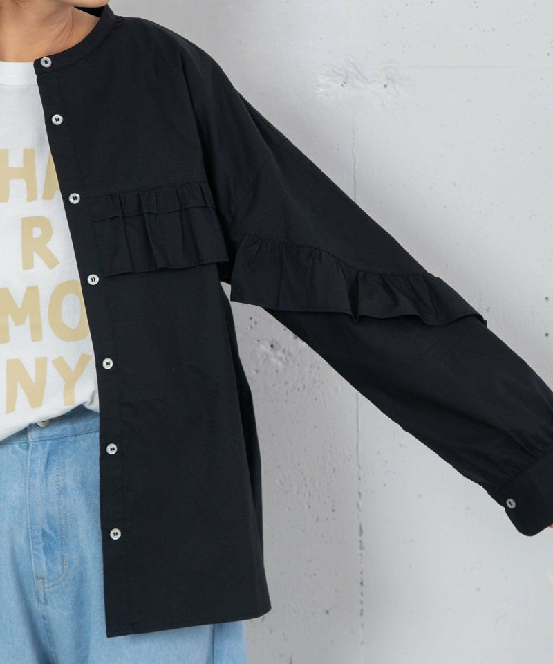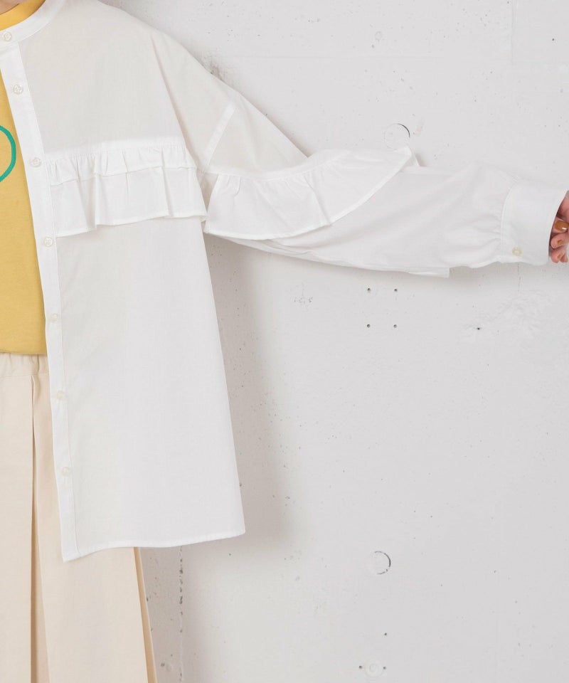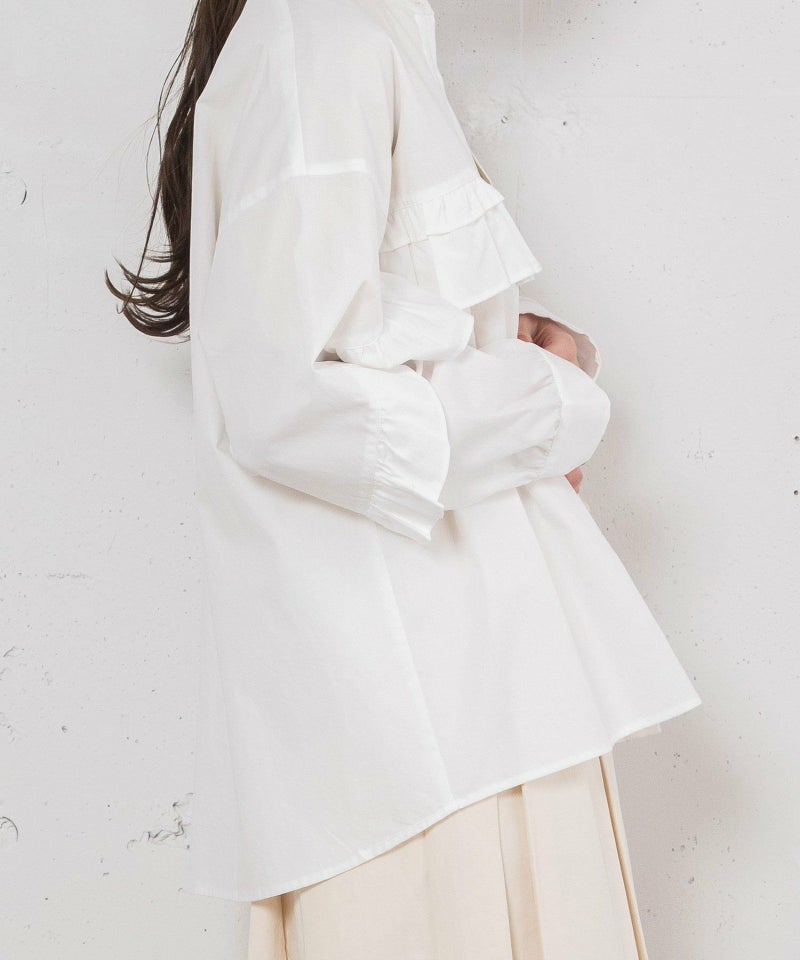 身頃から袖に続くフリルディテールがポイントのブラウス。1枚で華やかなスタイリングが完成です。細めのスタンドカラーでネック回りはすっきりと、肩が落ちたゆとりのあるシルエットで気負わずに着られます。