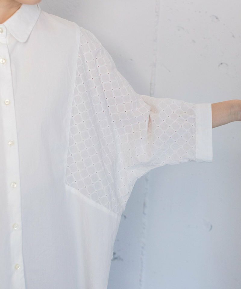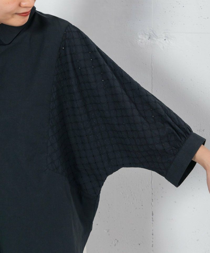 袖をエンブロイダリーレースで切り替えたブラウス。身頃側に切り替えたウェッジスリーブのデザインで、ゆったりとした袖周りです。角丸のシャツ衿がきちんと感もありながら優しい印象に。オフホワイトとブラックは同色系、ブルーのウインドゥペンチェックはオフホワイトのエンブロイダリーとかけ合わせた爽やかな配色です。フルオープンで羽織りとしても着られます。