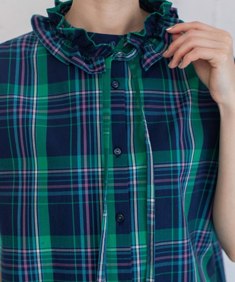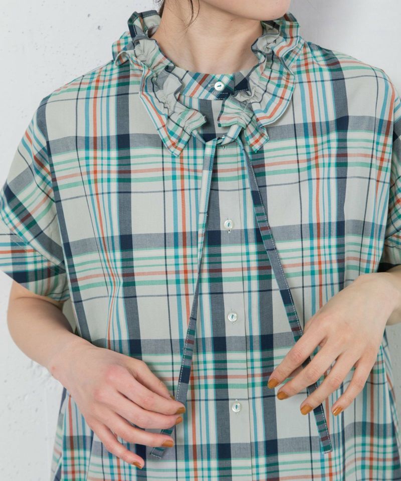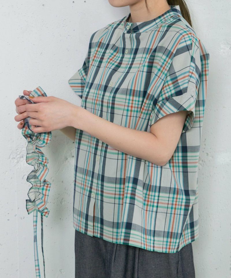 パッと目を惹くオリジナルのマドラスチェック柄のブラウス。多色使いながらもまとまったカラーリングで落ち着いた雰囲気に仕上げました。程よく首から離れたスタンドカラーがきちんと見えするデザイン。身頃続きの袖もゆったりとしていて涼しく着られます。フルオープンで羽織りとしても使えます。