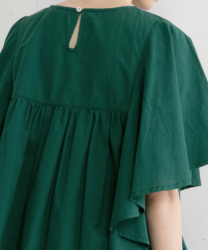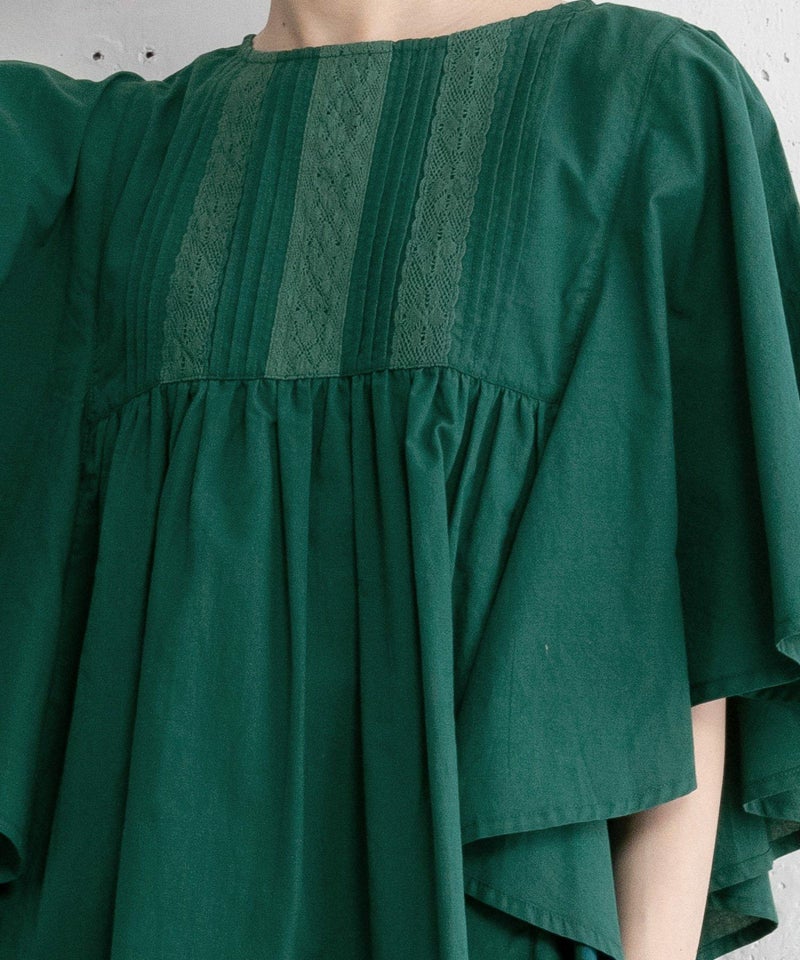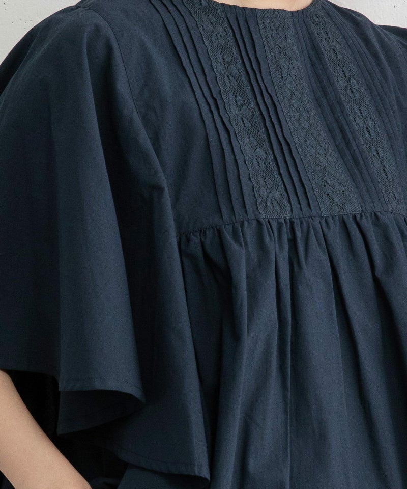ひらりと揺れるボリューム感のあるフレア袖のブラウス。1枚で着映えします。デニムやペインターパンツなどのカジュアルなボトムス合わせがおすすめです。胸元にあしらったピンタックとレースもポイント。